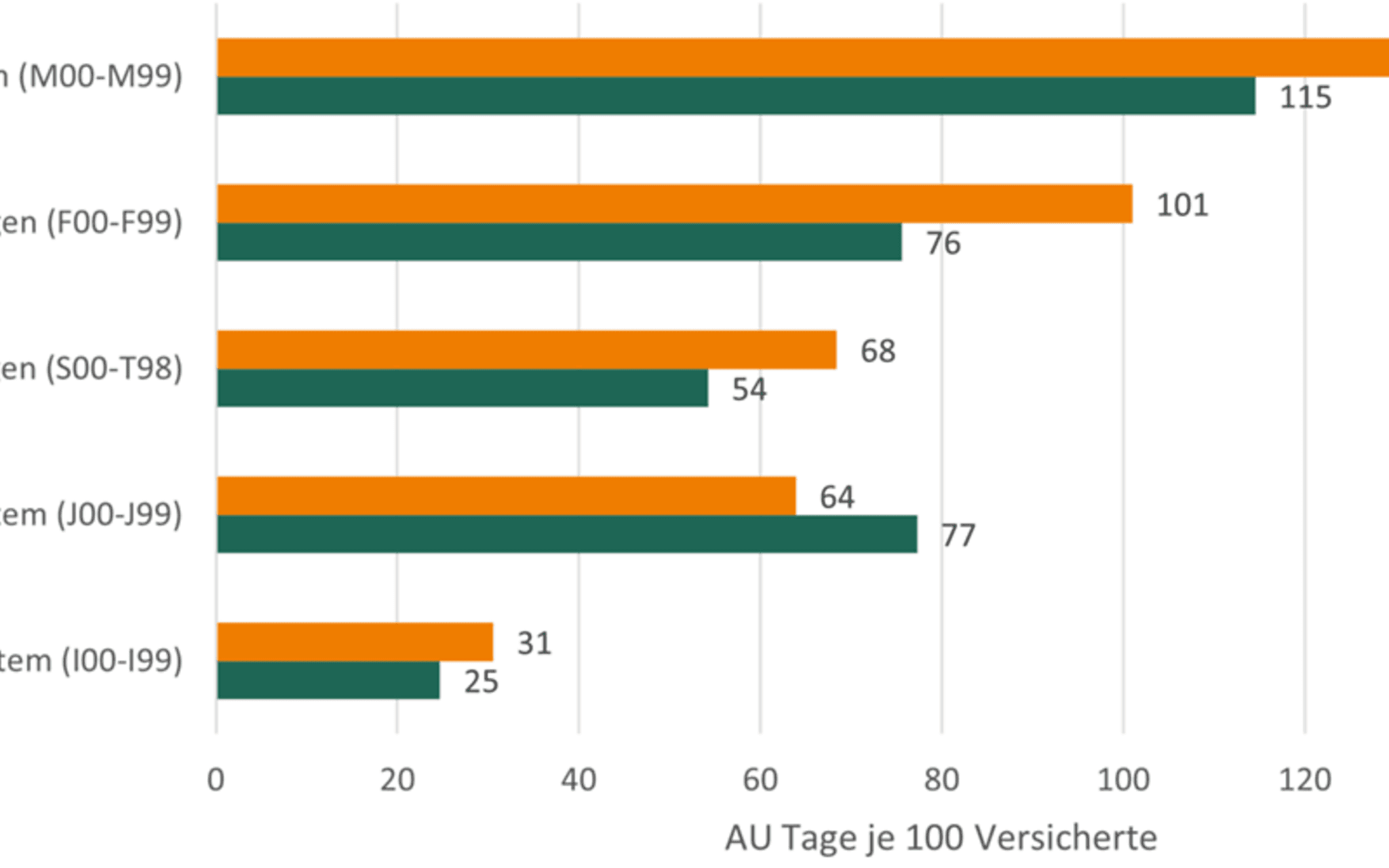 Den stärksten Anstieg verzeichneten Muskel-Skelett-Probleme und psychische Erkrankungen. In der letzteren Gruppe – zu der auch Depressionen und Angststörungen gehören – ging der Arbeitsausfall um 33,6 Prozent hoch, von 70 auf 101 Fehltage je 100 Beschäftigte.