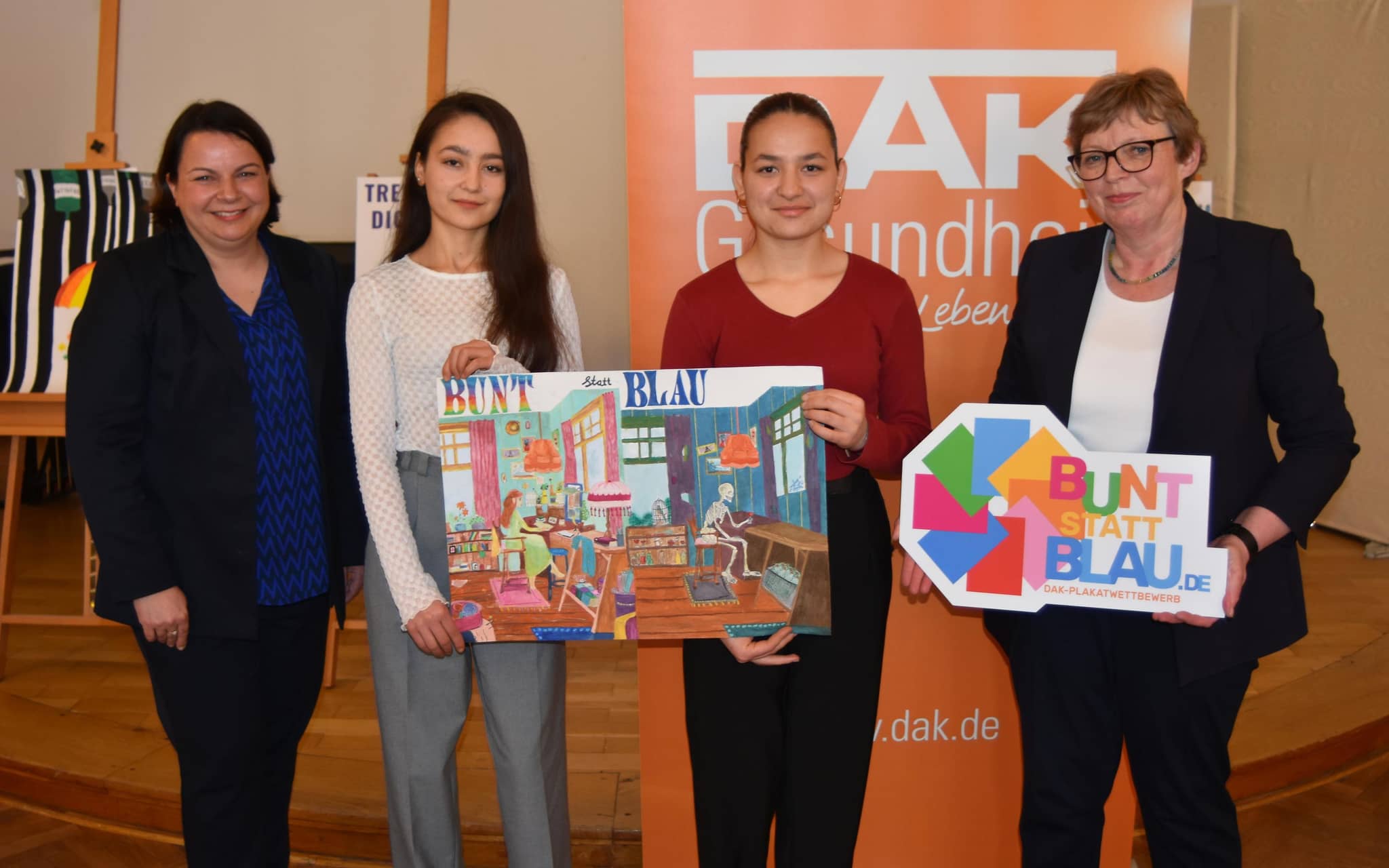 Bild herunterladen (Landessiegerinnen MV "bunt statt blau" 2024 v.li. Sozialministerin Stefanie Drese, Shabnam Rahimi, Samira Rahimi und Sabine Hansen, Leiterin der Landesvertretung der DAK-Gesundheit in MV / Copyright: DAK-Gesundheit/Poetig)