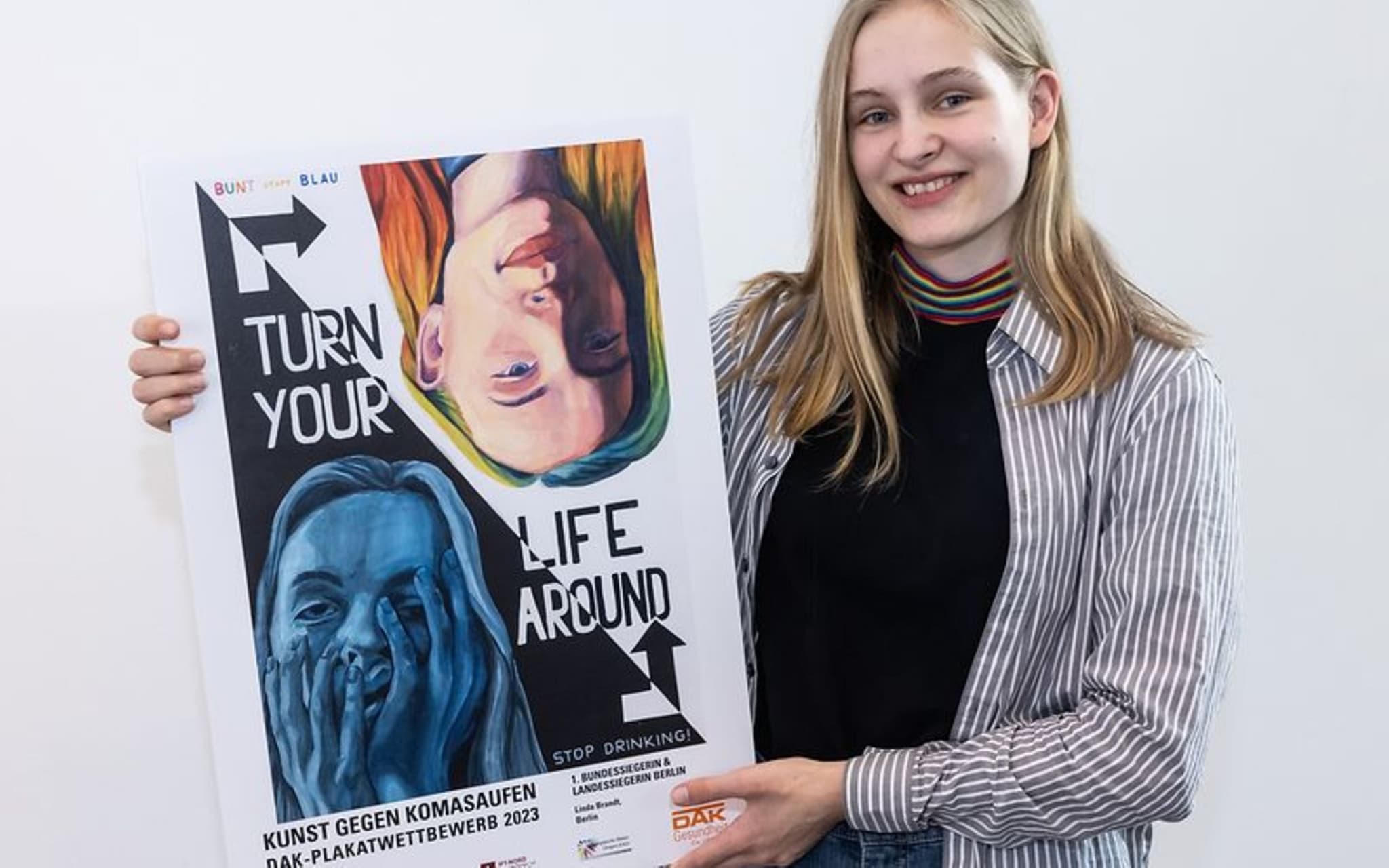 Hamburg/Berlin, 2. Juni 2023. Die Bundessiegerin 2023 von „bunt statt blau – Kunst gegen Komasaufen“ kommt aus Berlin: Linda Brandt gewinnt den bundesweiten DAK-Plakatwettbewerb. Über 7.000 Schülerinnen und Schüler hatten sich in diesem Jahr an der Präventionskampagne der DAK-Gesundheit zum Thema Alkoholmissbrauch beteiligt. Bundesschirmherr ist der Beauftragte der Bundesregierung für Sucht- und Drogenfragen Burkhard Blienert. Die Preise wurden am 1. Juni feierlich in Berlin verliehen. Seit dem Start von „bunt statt blau“ 2010 gestalteten insgesamt fast 130.000 Schülerinnen und Schüler zwischen zwölf und 17 Jahren kreative Plakate gegen das exzessive Rauschtrinken. Nach aktuellen Zahlen aus dem Kinder- und Jugendreport der DAK-Gesundheit kamen 2022 deutlich weniger Mädchen und Jungen mit einer Alkoholvergiftung in ein Krankenhaus als im Vorjahr.