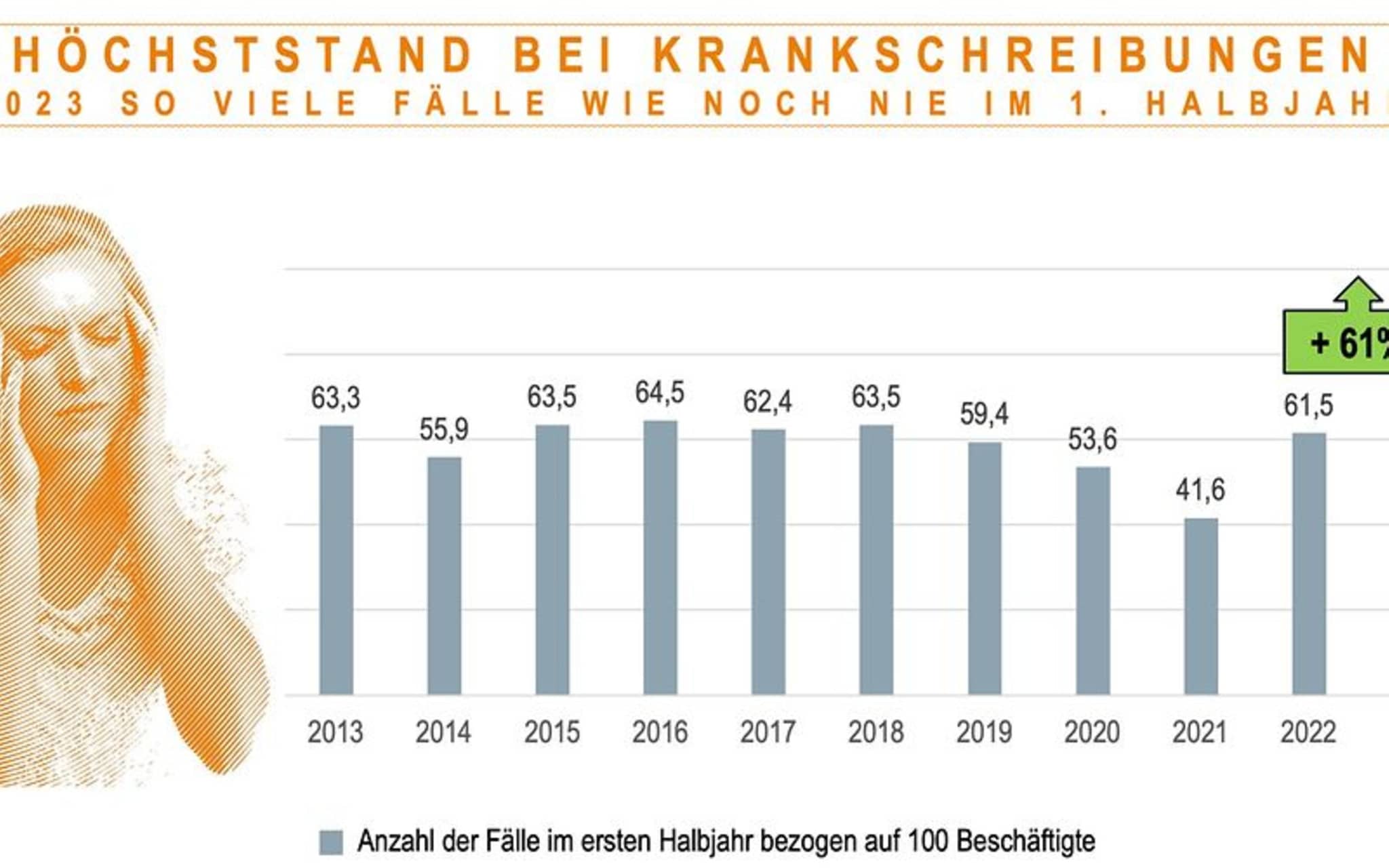 Atemwegserkrankungen waren für die Fehlzeiten der Beschäftigten im ersten Halbjahr 2023 so maßgeblich wie keine andere Erkrankungsart. Bei den Krankschreibungen wegen Husten, Schnupfen und anderen Infekten gab es fast eine Verdoppelung der Fälle – von 17,2 auf 34,1 je 100 Beschäftigte. Auch Krankschreibungen wegen Muskel-Skelett- und psychischer Erkrankungen waren deutlich häufiger als im Vorjahreshalbjahr (59 beziehungsweise 60 Prozent höhere Fallzahlen.)