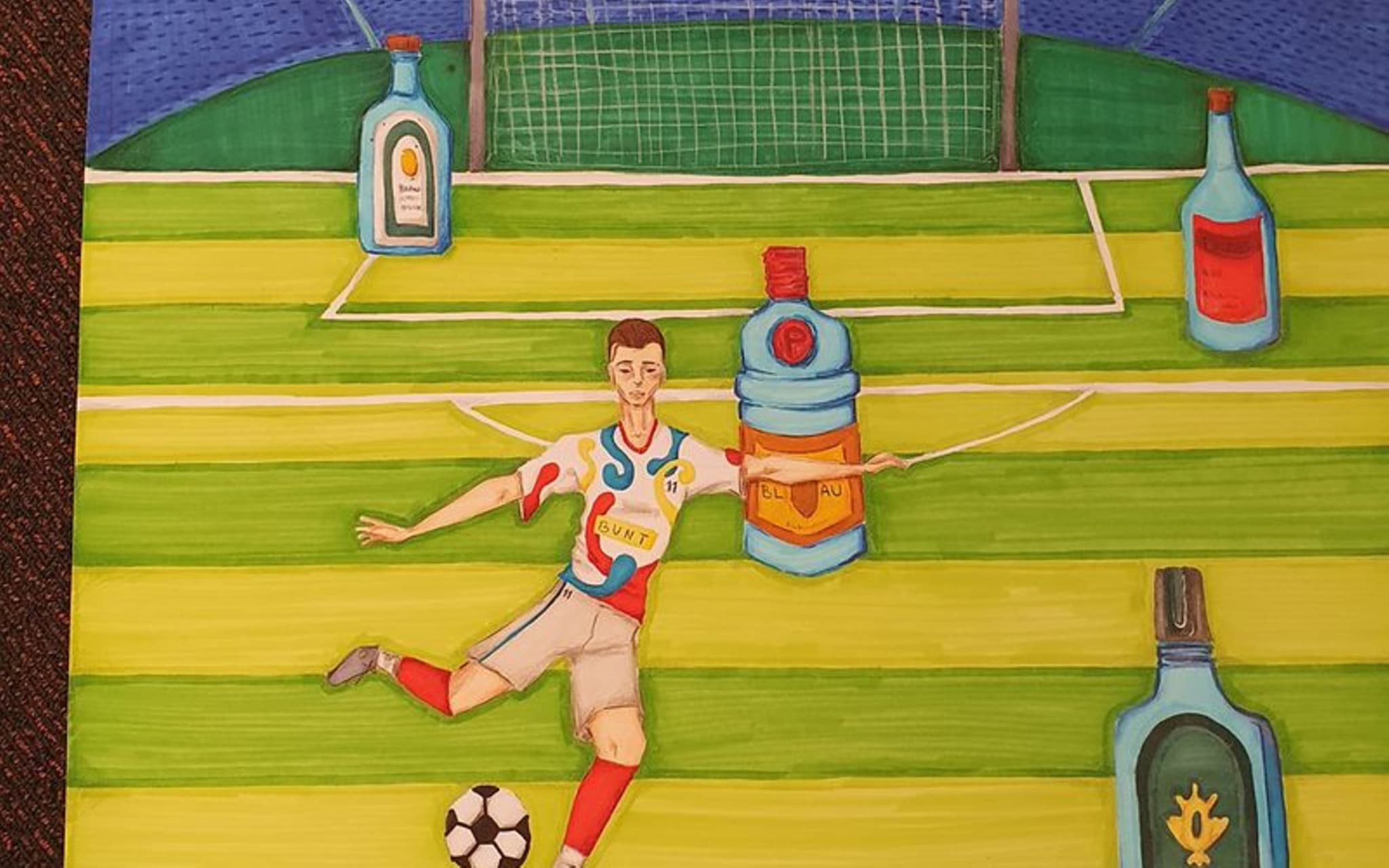 „Bist Du ein Gewinner?“ fragt Polly Virkus auf ihrem Siegerbild. Es zeigt einen bunten Fußballspieler, der um blaue Alkoholflaschen dribbelt. „Meine Inspiration für das Bild war der Sport. Denn besonders der Teamsport bringt uns zusammen, während der Alkoholmissbrauch das Gegenteil bewirkt.“, ist die Botschaft der vierzehnjährigen Schülerin des Hansa-Gymnasiums Stralsund. Mit ihrer beeindruckenden Arbeit gewann sie den Hauptpreis auf Landesebene in Höhe von 300 Euro. Der zweite Platz ging an das Team von Alina-Annabell Goerke (15), Fanni Pribbernow (14) und Hanna Emilia Taut (13) vom Friedrich-Franz-Gymnasium in Parchim. Rang drei belegte das Duo Jannes Dreyer und Tammo Donath, beide 13 Jahre alt und von der Ecolea Internationale Schule Schwerin. Für ihre Gemeinschaftsarbeit erhielten Laura Borchert (14), Maxine Ebel (13), Connor Rimmel und Sarina Ziemßen (beide 12) den Sonderpreis „Junge Talente“. Sie gehen in die sechste Klasse des Evangelischen Bildungscampus in Dettmannsdorf (Landkreis Vorpommern-Rügen).