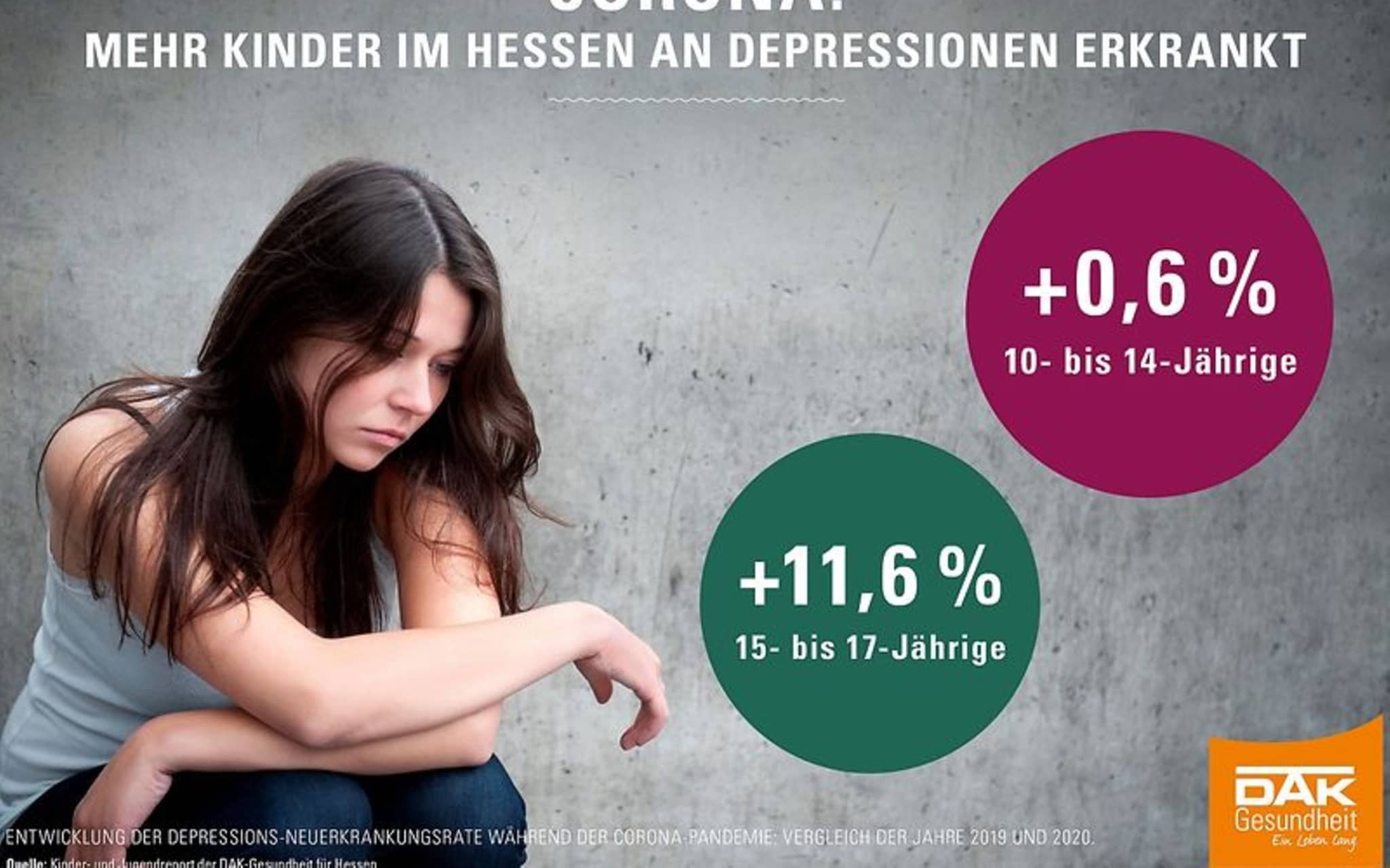 Der DAK-Report zeigt, dass die Corona-Pandemie vor allem Jugendliche im Alter von 15 bis 17 Jahren in Hessen psychisch belastet. So stieg die Zahl der Kinder in dieser Altersklasse, die erstmals mit einer Depression behandelt werden mussten, um rund zwölf Prozent. Im Bund waren es acht Prozent. Im späten Jugendalter waren Mädchen in Hessen doppelt so häufig aufgrund von Depressionen in ärztlicher Behandlung wie gleichaltrige Jungen. Bei den Zehn- bis 14-Jährigen war die Neuerkrankungsquote annähernd auf Vorjahresniveau, während sie im Bundesdurchschnitt leicht gesunken ist (minus drei Prozent).