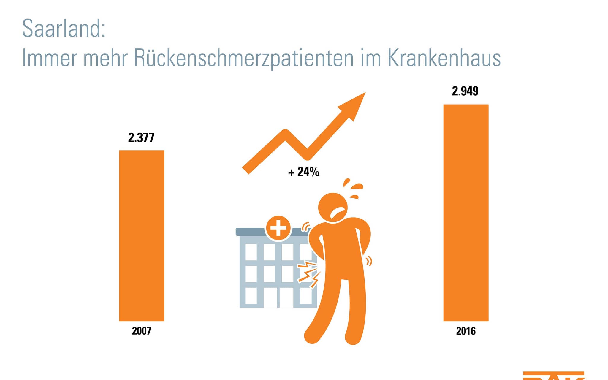 Der aktuelle DAK-Gesundheitsreport Saarland untersucht umfassend die krankheitsbedingten Ausfalltage sowie ambulante und erstmals auch stationäre Behandlungen bei Rückenerkrankungen im Bundesland. Die Analyse der anonymisierten DAK-Daten wird ergänzt durch eine repräsentative Umfrage. Das Forsa-Institut hat dafür vom 7. bis 29. November 2017 bundesweit 5.224 erwerbstätige Frauen und Männer im Alter von 18 bis 65 Jahren befragt. Zentrale Ergebnisse wurden mit einer DAK-Untersuchung aus dem Jahr 2003 verglichen.
