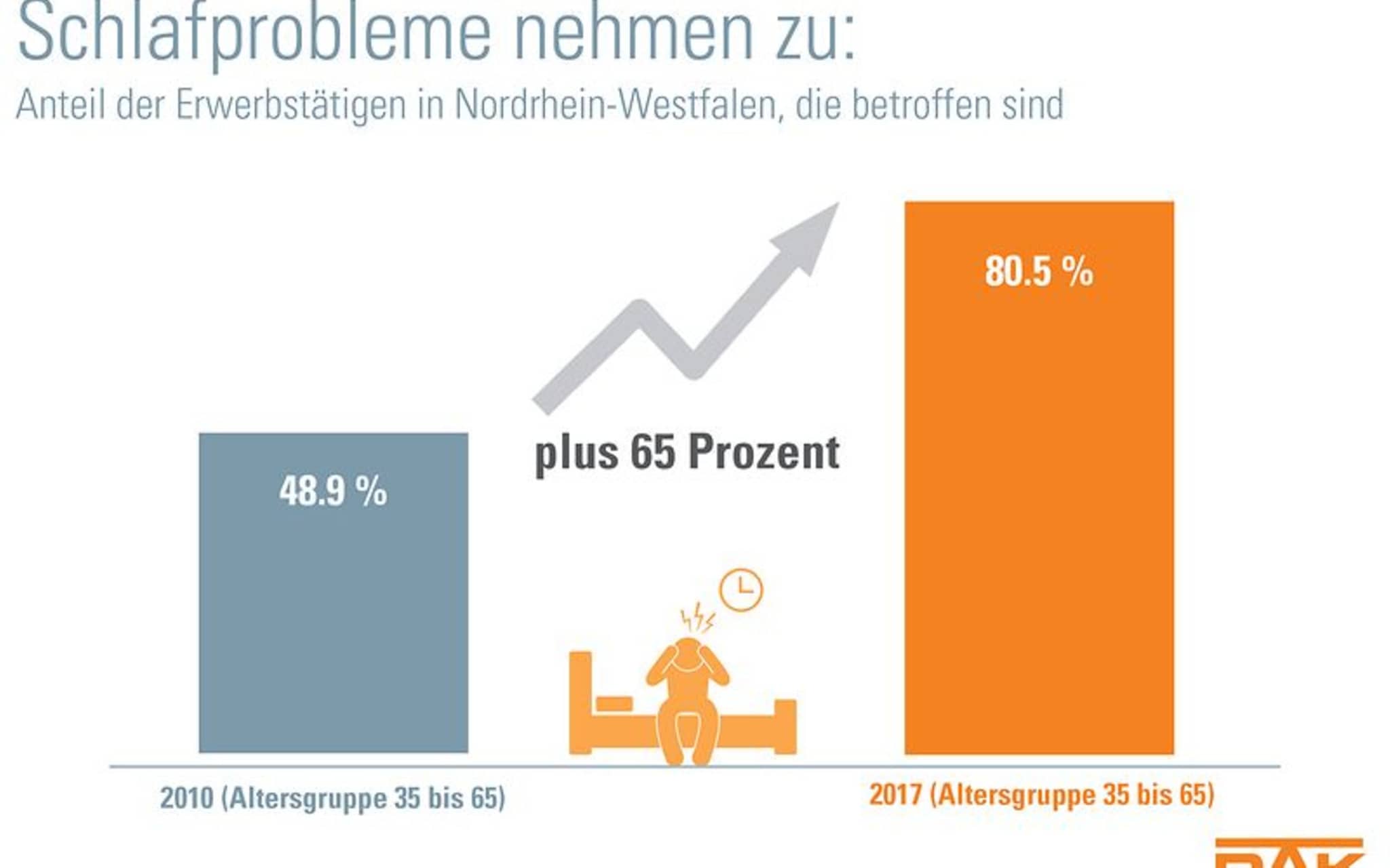 Schlaf ist laut DAK-Gesundheitsreport auch für diejenigen ein Thema, die zwar nicht unter einer krankheitswertigen Störung leiden, aber wiederkehrend Einschlaf- oder Durchschlafprobleme haben. So bekennen sich in der DAK-Befragung rund 79 Prozent der erwerbstätigen Nordrhein-Westfalen zwischen 18 und 65 Jahren zu Einschlaf- oder Durchschlafproblemen. 35 Prozent geben an, dass sie dreimal pro Woche oder häufiger betroffen sind. Zum Vergleich: Bei der DAK-Untersuchung von vor sieben Jahren konnte in der Altersgruppe der 35- bis 65-Jährigen noch jeder Zweite gut schlafen (51 Prozent). Heute gehören in NRW nur 19,5 Prozent zu den Gut-Schläfern.