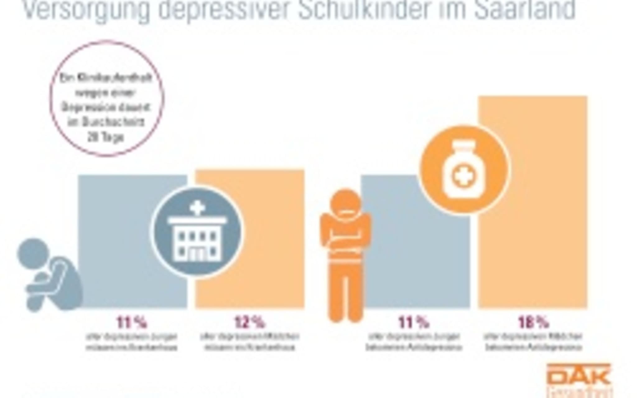22 Prozent aller saarländischen Schulkinder im Alter von zehn bis 17 Jahren sind von einer psychischen Erkrankung oder Verhaltensstörung betroffen. Vor allem jüngere Schulkinder fallen am häufigsten durch Entwicklungsstörungen auf, zu denen Sprach- und Sprechstörungen gehören. Auch Verhaltensstörungen, wie etwa ADHS sind verbreitet. Seltener, aber von hoher Relevanz für die Versorgung, sind affektive Störungen, zu denen auch die Depressionen gehören. Fast zwei Prozent aller DAK-versicherten Jungen und Mädchen im Alter von 10 bis 17 Jahren sind so stark betroffen, dass sie einen Arzt aufsuchen. Damit sind Schulkinder im Saarland seltener betroffen als Gleichaltrige im Bundesdurchschnitt. Ein Drittel der Schulkinder leidet an mittelgradig schweren Depressionen. Bei 28 Prozent wurden leichte Depressionen festgestellt. Mädchen leiden im späten Jugendalter dreimal häufiger unter Depressionen wie Jungen. Mit einer diagnostizierten Angststörung kämpfen 2,2 Prozent aller Schulkinder. Hochgerechnet auf alle Kinder und Jugendlichen im Saarland entspricht dies etwa 2.300 mit Angststörungen oder Depressionen. Diese Störungsbilder treten auch parallel auf: Jeder sechste Junge im Saarland mit einer diagnostizierten Depression hat parallel auch eine Angststörung. Bei den Mädchen ist es jedes vierte.