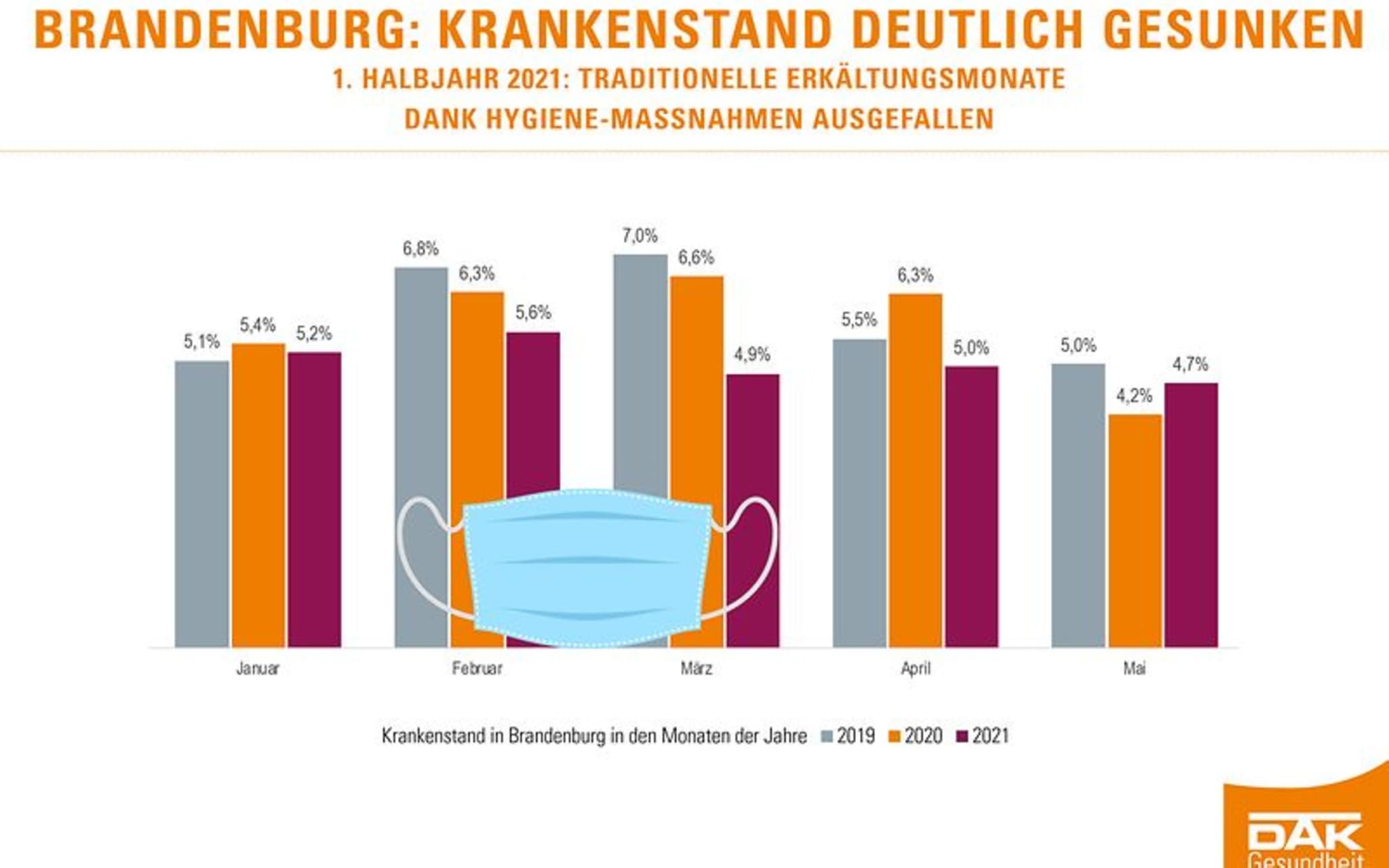 Potsdam, 31. August 2021. Beschäftigte in Brandenburg fehlten im ersten Halbjahr 2021 so wenig wie seit Jahren nicht mehr. Der Krankenstand ist landesweit im Vergleich zum Vorjahreszeitraum um 0,4 Prozentpunkte gesunken. Er liegt dennoch mit 4,9 Prozent an der Spitze aller Bundesländer und weit über Bundesniveau (3,7 Prozent). Somit waren an jedem Tag durchschnittlich 49 von 1.000 Beschäftigte in der Mark krankgeschrieben. Den niedrigsten Krankenstand im ersten Halbjahr 2021 hatte Baden-Württemberg mit 3,0 Prozent. Hintergrund dieses gesunkenen Krankenstands ist der massive Rückgang der Atemwegserkrankungen (minus 56 Prozent). Das geht aus der aktuellen Krankenstands-Analyse der DAK-Gesundheit für Brandenburg hervor. Die Kasse sieht die geltenden Abstands- und Hygienemaßnahmen während der Pandemie als Ursache. Der Rückgang betrifft fast alle Berufsgruppen. Während Fehltage wegen Atemwegserkrankungen weniger wurden, blieben diese bei Muskel-Skelett-Erkrankungen konstant und stiegen bei psychischen Leiden. Sie gehören weiterhin zu den wichtigsten Ursachen für Krankschreibungen.