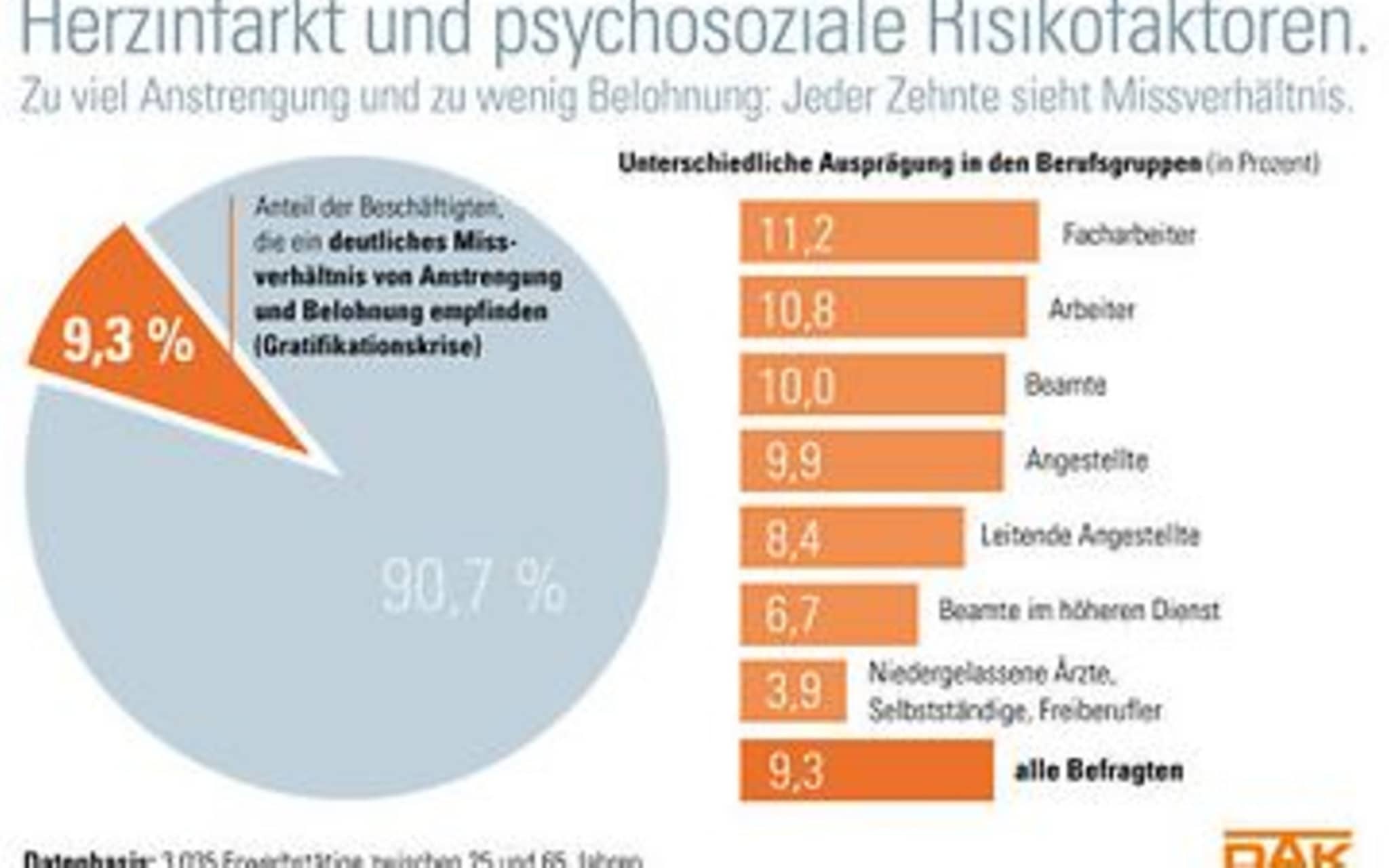 Um die Verbindungen von Herzinfarkt und Arbeitswelt genauer zu analysieren, hat die DAK-Gesundheit eine repräsentative Befragung von über 3000 Berufstätigen durchgeführt. Der Gesundheitsreport zeigt ein überraschendes Ergebnis: Die in den Medien geführte Debatte um Burn-out und psychische Belastungen am Arbeitsplatz ließe erwarten, dass ein großer Anteil der Arbeitnehmer gesundheitlich stark gefährdet ist. Doch nur knapp jeder zehnte Befragte (9,3 Prozent) leidet unter einer sogenannten beruflichen Gratifikationskrise. Damit wird eine besondere Form von arbeitsbedingtem Stress beschrieben, die durch eine mangelnde Anerkennung im Beruf ausgelöst wird. Eine Gratifikationskrise entsteht, wenn für Beschäftigte die Belohnung nicht mehr im Verhältnis zu ihrer Anstrengung steht. Sowohl das Gehalt wie auch die Anerkennung können hier eine Rolle spielen. Für diesen Personenkreis besteht ein mehr als doppelt so hohes Herzinfarktrisiko. Auffällig ist, dass Gratifikationskrisen je nach beruflichem Status unterschiedlich häufig sind. „Je größer Selbstbestimmung und Gestaltungsmöglichkeiten am Arbeitsplatz sind, um so weniger tritt dieses Problem auf“, erklärt Herbert Rebscher. So leiden Facharbeiter mit 11,2 Prozent überproportional daran, ebenso Arbeiter mit 10,8 Prozent. „Hier besteht der eigentliche Handlungsbedarf in den Betrieben“, so der Chef der DAK-Gesundheit. Unterdurchschnittlich von einer Gratifikationskrise betroffen sind Selbstständige und Freiberufler mit 3,9 Prozent sowie Beamte im höheren Dienst mit 6,7 Prozent. Überraschend: Betriebliche Zielvereinbarungen, bei denen Verantwortung für messbare Arbeitsergebnisse auf Beschäftigte übertragen wird, führen nicht zu mehr Gratifikationskrisen.