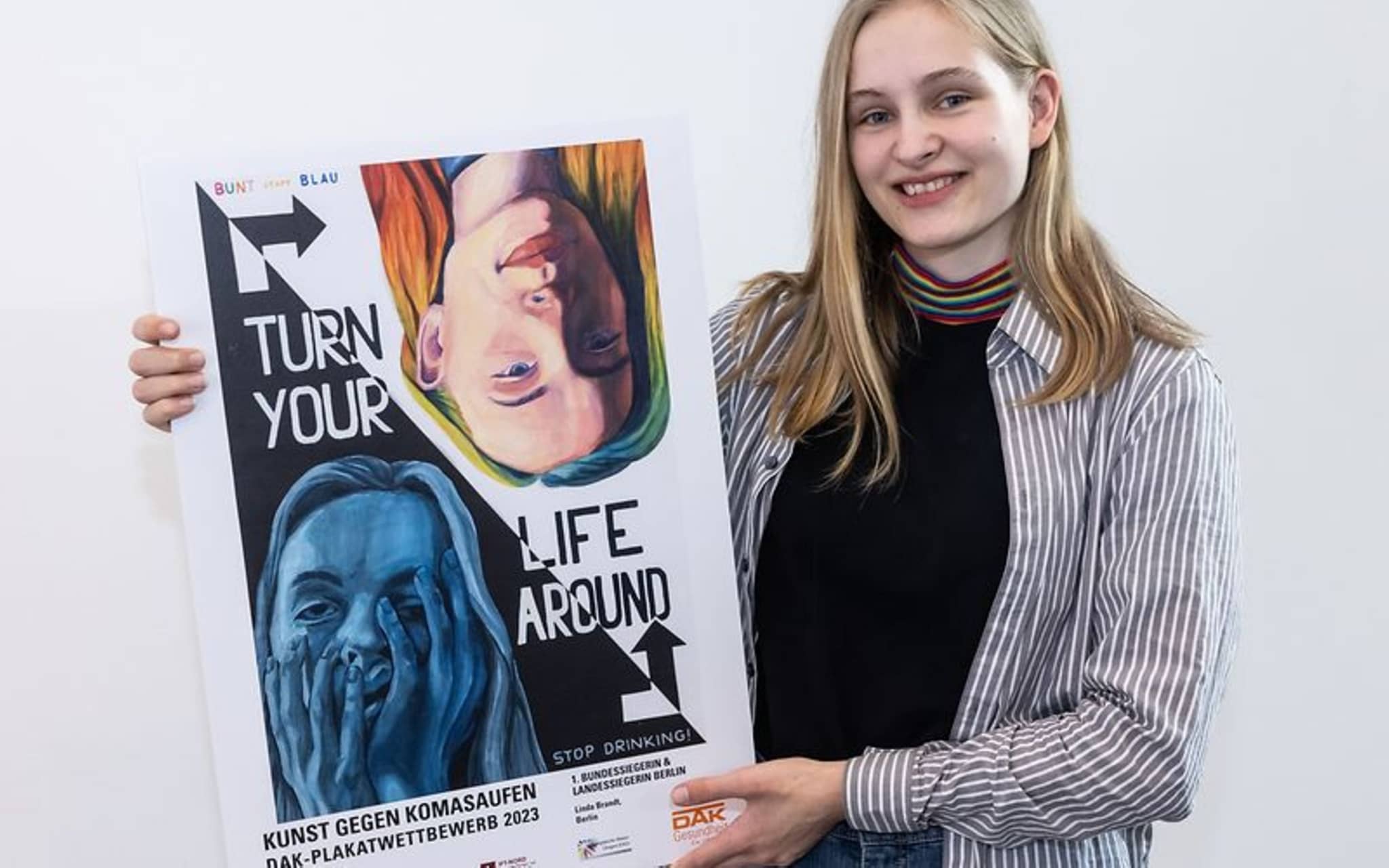 Mit dem Bundessieg kann sich die 17-jährige Linda Brandt aus Berlin über den Hauptpreis von 500 Euro freuen. „Mit meinem Bild wollte ich in erster Linie ein ästhetisches Plakat entwerfen, welches Menschen auffällt und somit auch zum weiteren Nachdenken anregen kann. Die beiden Bildhälften zeigen den starken Kontrast zwischen einem Leben mit und ohne exzessiven Alkoholkonsum“, beschreibt die Bundessiegerin ihre Plakat-Idee. Platz zwei geht an die 13-jährige Jamina Tasdemir aus Bremen. Brandenburg gewinnt in diesem Jahr Bronze: Marla Olck aus Königs Wusterhausen holt sich Platz drei. Der Sonderpreis in der Kategorie „Junge Talente“ geht an Luisa Fuchs und Sophie Schuljak aus Isernhagen in Niedersachsen. Beim Sonderpreis „Instagram“ liegt Baden-Württemberg vorne: Hier überzeugte Julia-Tosca Schuler die Bundesjury.