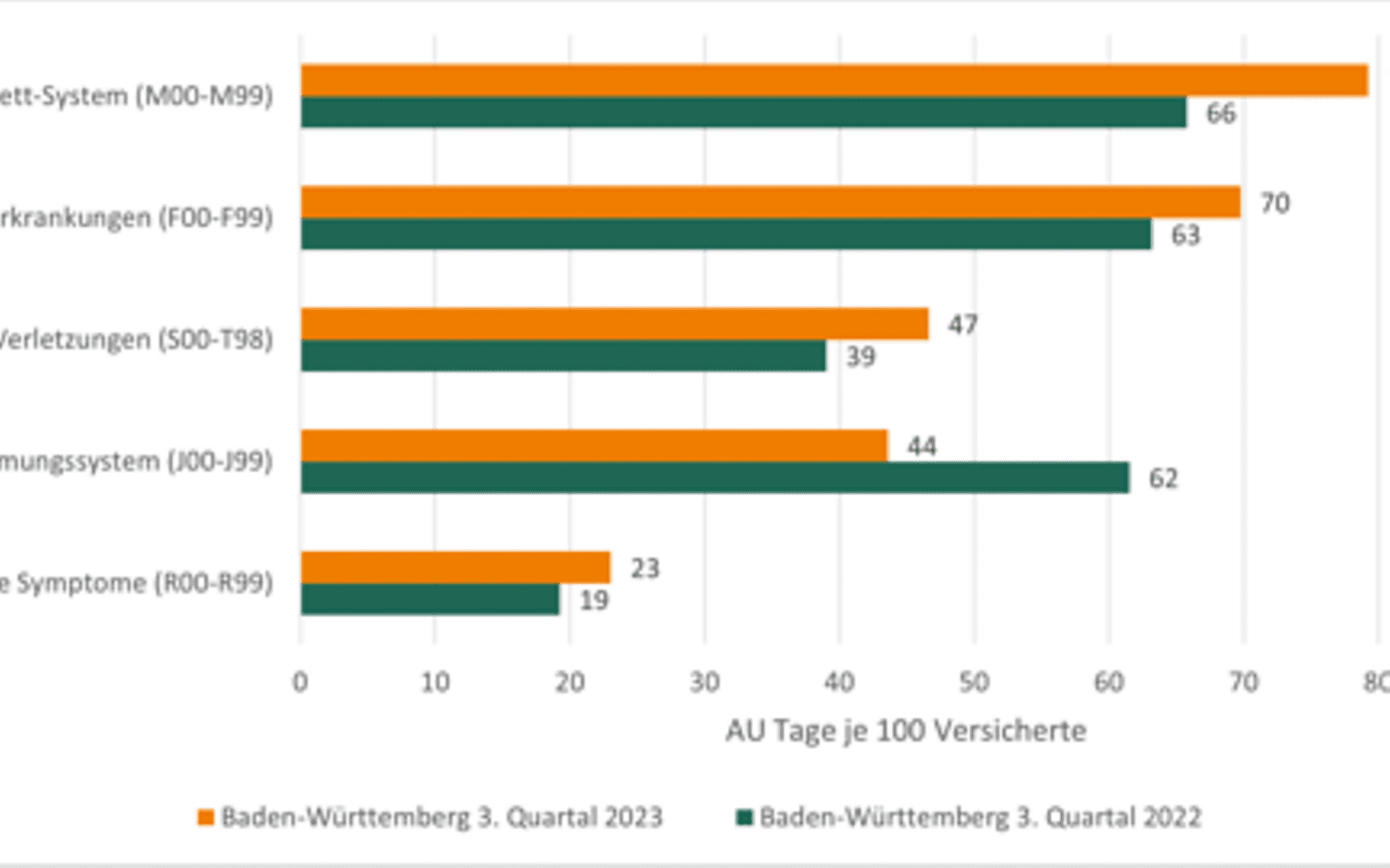 Den stärksten Anstieg verzeichneten Muskel-Skelett-Probleme und psychische Erkrankungen. In der letzteren Gruppe – zu der auch Depressionen und Angststörungen gehören – ging der Arbeitsausfall um 10,4 Prozent hoch, von 63 auf 70 Fehltage je 100 Beschäftigte.