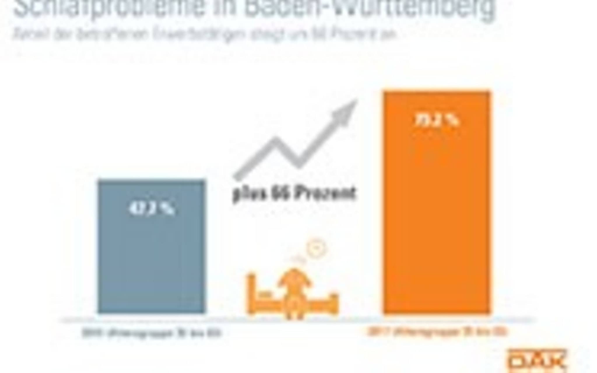 Laut DAK-Gesundheitsreport leidet jeder elfte Arbeitnehmer (9,1 Prozent) in Baden-Württemberg unter schweren Schlafstörungen (Insomnien) mit Ein- und Durchschlafstörungen, schlechter Schlafqualität, Tagesmüdigkeit und Erschöpfung. Anders als im Bundesdurchschnitt sind Männer im Südwesten mit über zehn Prozent etwas häufiger betroffen als Frauen (acht Prozent). Bei der Reportbefragung berichten insgesamt knapp 80 Prozent der Erwerbstätigen in Baden-Württemberg von Schlafproblemen. Seit 2010 stieg der Anteil der von Ein- und Durchschlafproblemen betroffenen 35- bis 65-jährigen Arbeitnehmer um 66 Prozent an. Schwere Schlafstörungen (Insomnien) haben sich seit 2010 sogar verdoppelt (plus 100 Prozent).