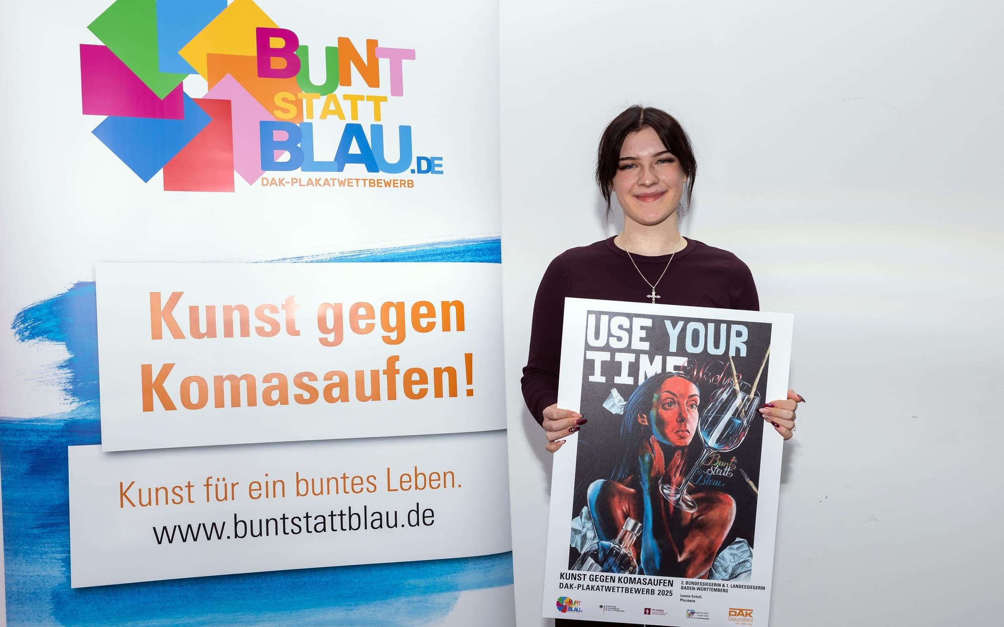 „bunt statt blau – Kunst gegen Komasaufen“ 2025 ist bereits die sechzehnte Auflage des kreativen Plakatwettbewerbs. Insgesamt haben seit 2010 über 143.000 Schülerinnen und Schüler an der Aktion teilgenommen, die im Drogen- und Suchtbericht der Bundesregierung als beispielhafte Präventionskampagne genannt wird. Sie ist seit April 2010 von der Europäischen Kommission zertifiziert und erhielt zahlreiche Auszeichnungen.