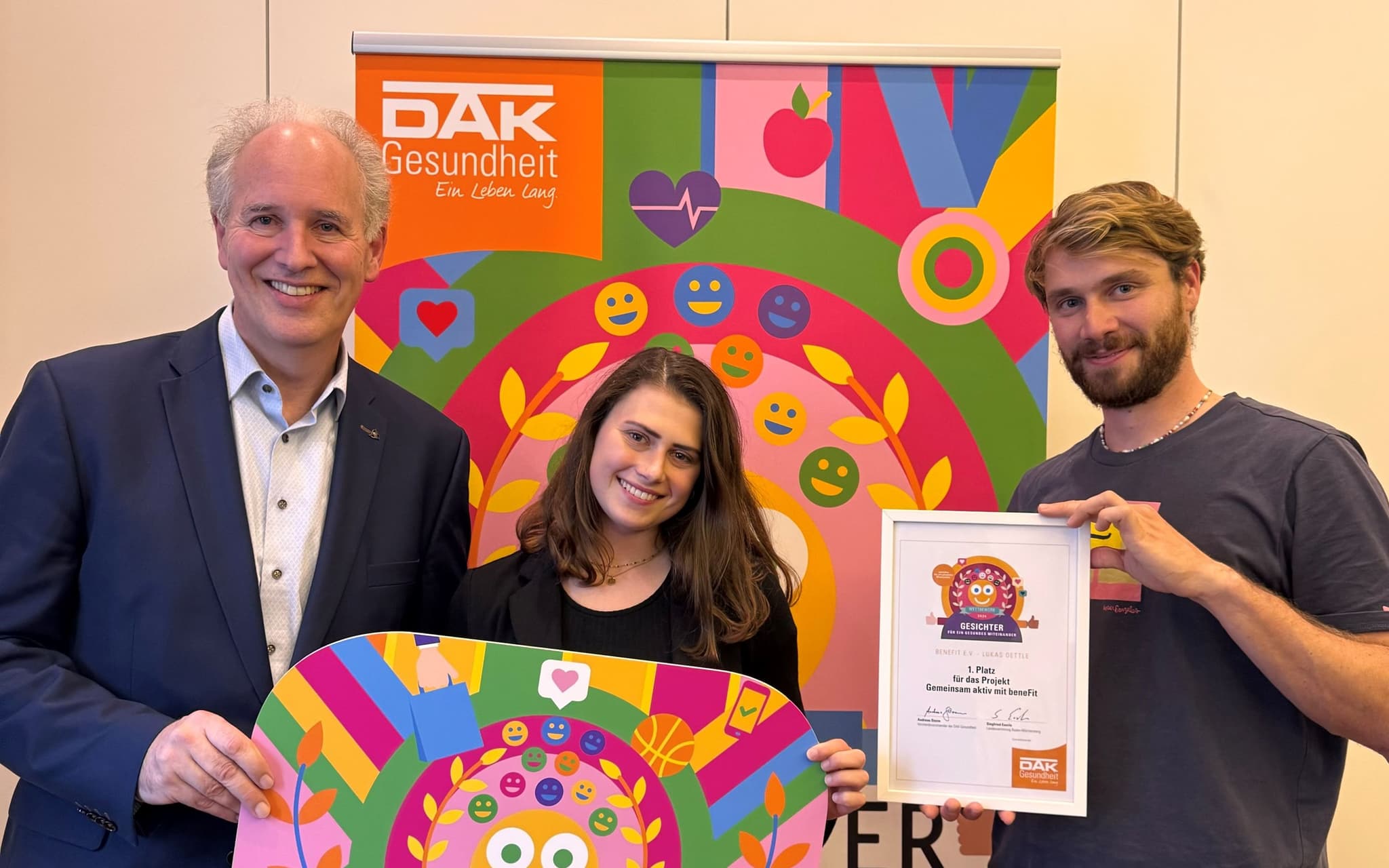 Bild herunterladen (Copyright: DAK-Gesundheit/Caroppo)(v.l.n.r. DAK-Landeschef Siegfried Euerle, „beneFit“-Projektkoordinatorin Miriam Iwan und Lukas Oettle, geschäftsführender Vorstand „beneFit“ e.V. Freiburg)