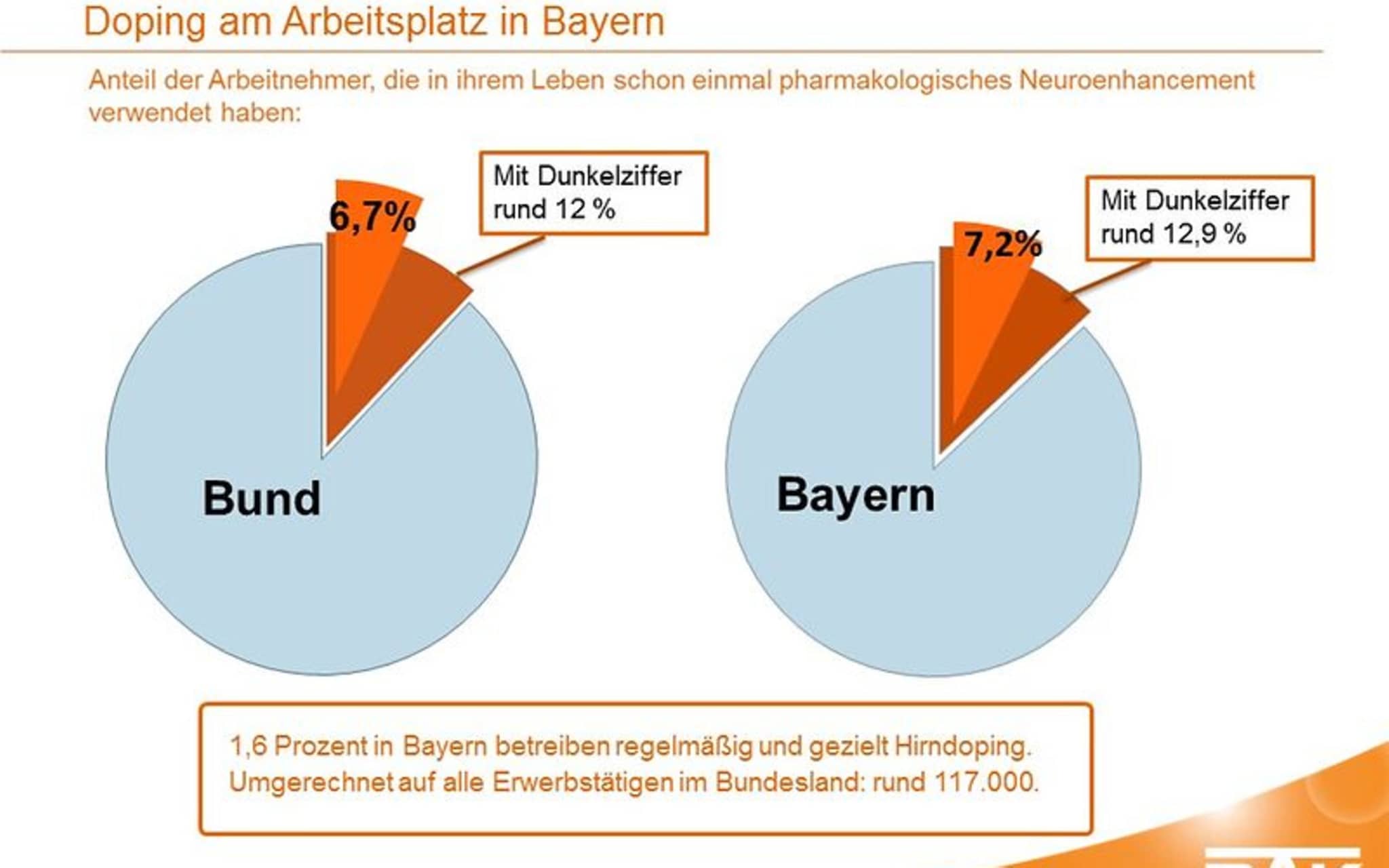 Für die repräsentative Studie wertete das IGES Institut die Fehlzeiten aller erwerbstätigen DAK-Mitglieder in Bayern aus. Es wurden zudem Arzneimitteldaten der Kasse analysiert und bundesweit mehr als 5.000 Beschäftigte im Alter von 20 bis 50 Jahren befragt. Demnach haben sich 7,2 Prozent der Berufstätigen in Bayern schon einmal gedopt – mit Dunkelziffer sogar bis zu 12,9 Prozent. Hochgerechnet auf die Erwerbstätigen in Bayern sind das 926.000 Menschen, die schon einmal leistungssteigernde oder stimmungsaufhellende Medikamente genommen haben. Derzeit betreiben etwa 117.000 der Erwerbstätigen in Bayern regelmäßig und gezielt Hirndoping. „Auch wenn Doping im Job noch kein Massenphänomen ist, sind diese Ergebnisse ein Alarmsignal“, warnt Gottfried Prehofer, Landeschef der DAK-Gesundheit in Bayern. „Nebenwirkungen und Suchtgefahr sind nicht zu unterschätzen. Deshalb müssen wir auch beim Thema Gesundheit vorausschauen und über unsere Wertvorstellungen und Lebensstilfragen diskutieren.“