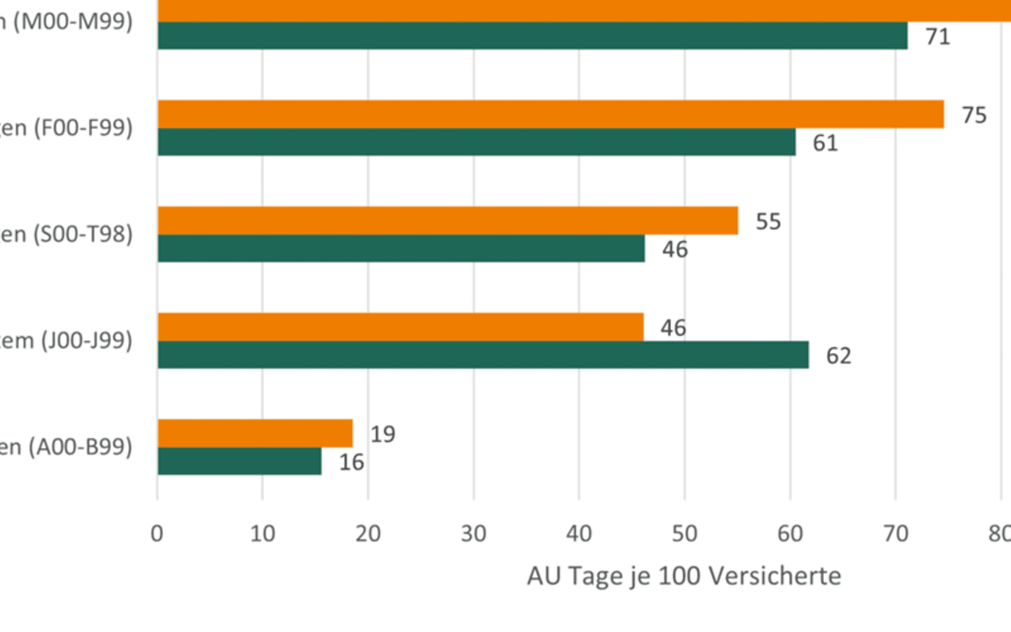 Den stärksten Anstieg verzeichneten Muskel-Skelett-Probleme und psychische Erkrankungen. In der letzteren Gruppe – zu der auch Depressionen und Angststörungen gehören – ging der Arbeitsausfall um 23,3 Prozent hoch, von rund 61 auf 75 Fehltage je 100 Beschäftigte.
