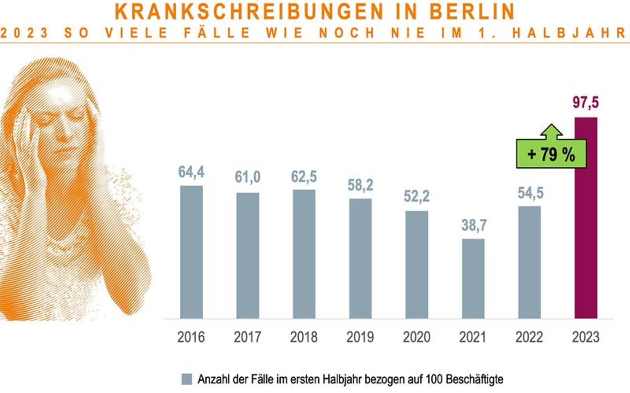 Auf die Fehlzeiten der Beschäftigten haben sich vor allem die häufigen Atemwegserkrankungen ausgewirkt. So hatten 100 Beschäftigte im Durchschnitt rund 34 Krankschreibungs-Fälle wegen beispielsweise Husten oder Schnupfen. Im ersten Halbjahr 2022 waren es dagegen nur knapp 15 Fälle. Zu einem deutlichen Anstieg kam es ebenfalls bei den Muskel-Skelett-Erkrankungen. Hier ging die Fallzahl bezogen auf 100 Beschäftigte von rund sechs auf knapp elf Fälle hoch. Bei Depressionen und anderen psychischen Erkrankungen gab es bezogen auf 100 Beschäftigte rund fünf Fälle (2022: rund drei). Die Fehlzeiten durch Corona gingen in Berlin um etwa drei Viertel zurück. Sie hatten nur noch einen Anteil von knapp zwei Prozent am Krankenstand. Im ersten Halbjahr 2022 waren es noch rund acht Prozent.