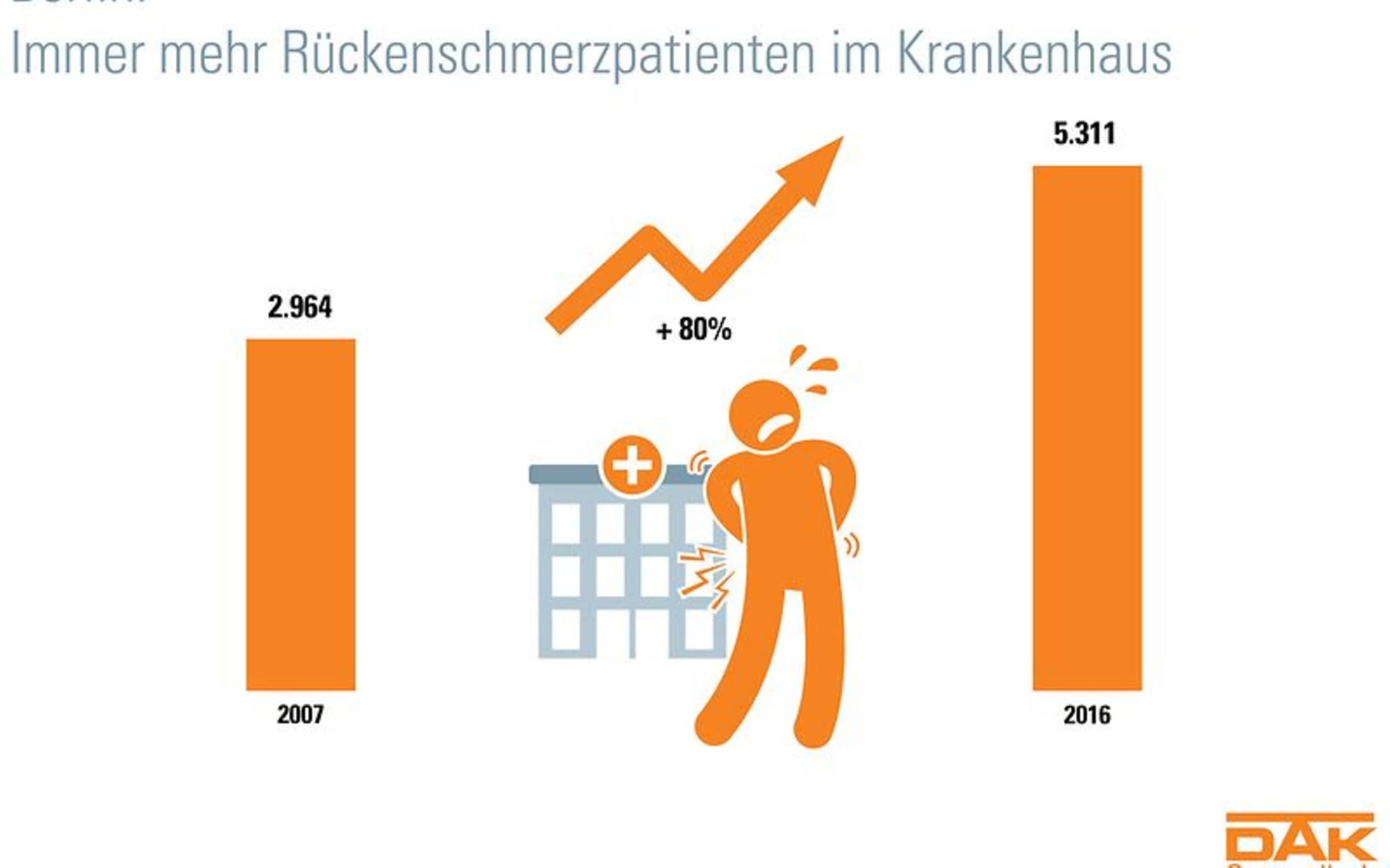 15. Mai 2018. Rätsel Rücken: Trotz Prävention und zahlreicher Gesundheitskurse leiden in Berlin mehr als 1,2 Millionen Erwerbstätige unter Rückenschmerzen. Immer mehr gehen mit ihren Beschwerden direkt ins Krankenhaus. Seit dem Jahr 2007 stieg die Zahl der stationären Behandlungen in Berlin um fast 80 Prozent an. Hochgerechnet auf alle Erwerbstätigen im Land kamen 2017 mehr als 1,5 Millionen Ausfalltage wegen Rückenschmerzen zusammen. Das zeigt der aktuelle DAK-Gesundheitsreport „Rätsel Rücken – warum leiden so viele Berliner unter Schmerzen?“. Nach der Umfrage hatten 69 Prozent aller Beschäftigten im vergangenen Jahr Rückenschmerzen. Jeder Vierte hat aktuell Beschwerden.