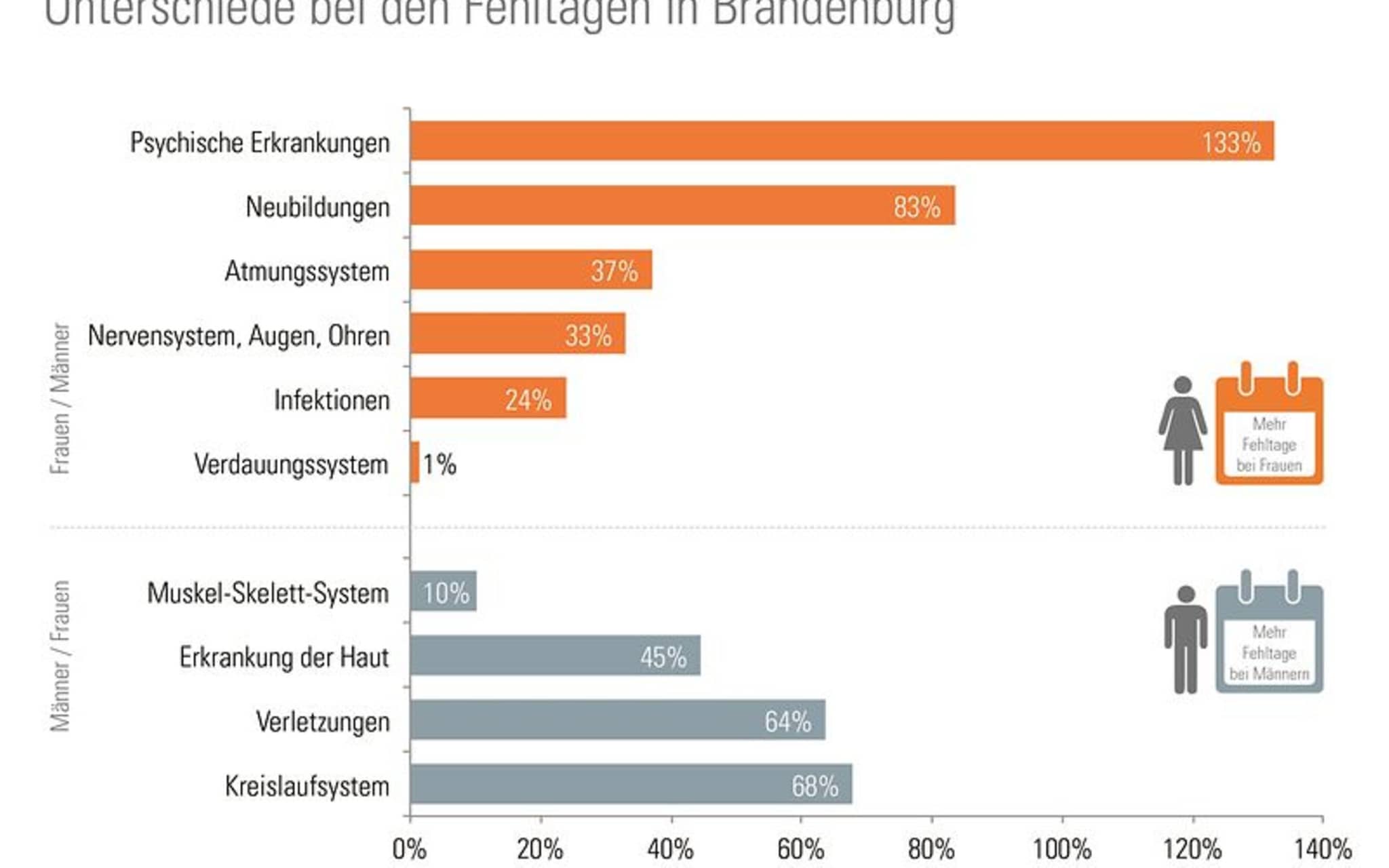 Erwerbstätige Männer in Brandenburg leiden deutlich häufiger als Frauen unter Herz-Kreislauf-Problemen (+ 68 Prozent mehr Fehltage) und sind öfter von Verletzungen betroffen (+ 64 Prozent mehr Fehltage). Frauen in Brandenburg haben hingegen 133 Prozent mehr Fehltage wegen psychischer Erkrankungen.