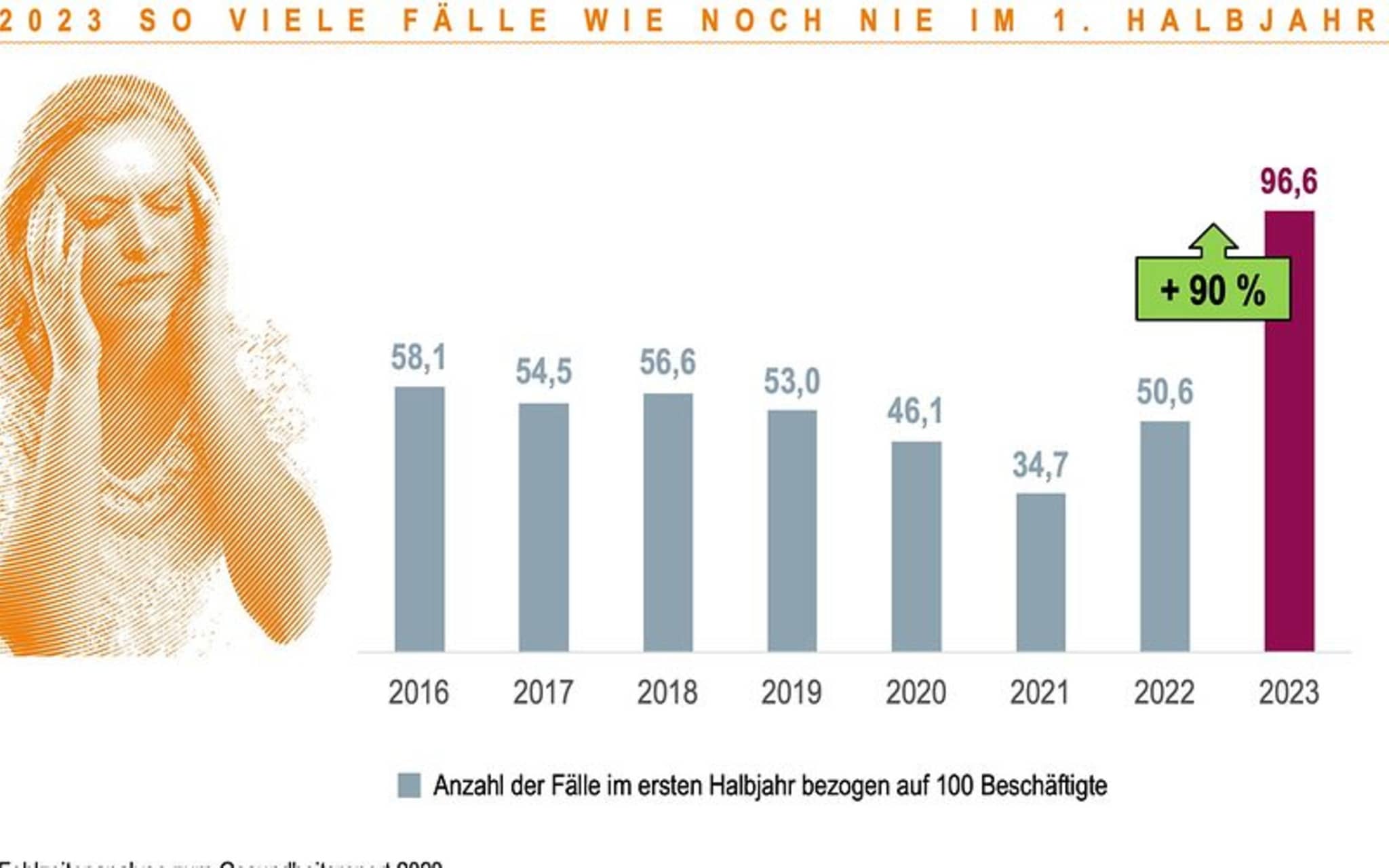 Zu einem deutlichen Anstieg kam es ebenfalls bei den Muskel-Skelett-Erkrankungen. Hier ging die Anzahl der Fälle bei 100 Beschäftigten von knapp 6 auf rund 11 Fälle hoch. Bei Depressionen und anderen den psychischen Erkrankungen gab es bezogen auf 100 Beschäftigte knapp 5 Fälle (2022: rund 3).
