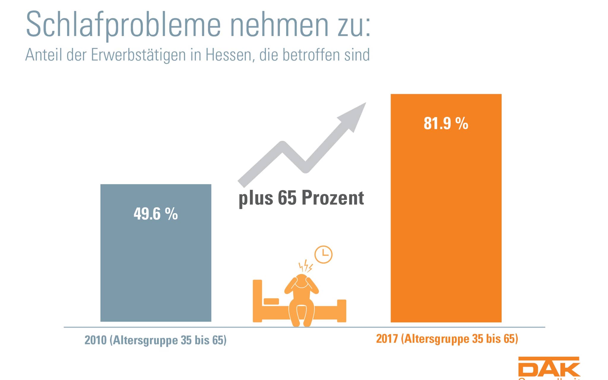 Laut DAK-Gesundheitsreport leidet etwa jeder zehnte Arbeitnehmer (9,3 Prozent) in Hessen und den angrenzenden Bundesländern unter schweren Schlafstörungen (Insomnien) mit Ein- und Durchschlafstörungen, schlechter Schlafqualität, Tagesmüdigkeit und Erschöpfung. Angestellte sind mit elf Prozent etwas häufiger betroffen als Arbeiter (7,6 Prozent). Bei der Reportbefragung berichten insgesamt rund 80 Prozent der Erwerbstätigen in Hessen von Schlafproblemen. Seit 2010 stieg der Anteil der von Ein- und Durchschlafproblemen betroffenen 35- bis 65-jährigen Arbeitnehmer um 65 Prozent an. Bei schwere Schlafstörungen (Insomnien) gab es seit 2010 einen Anstieg von 18 Prozent. Die Einnahme von Schlafmitteln hat sich noch rasanter entwickelt. Der Anteil derjenigen, die in den vergangenen drei Monaten mindestens einmal ein Schlafmittel eingenommen haben, stieg in sechs Jahren von 4,9 auf 10,3 Prozent.