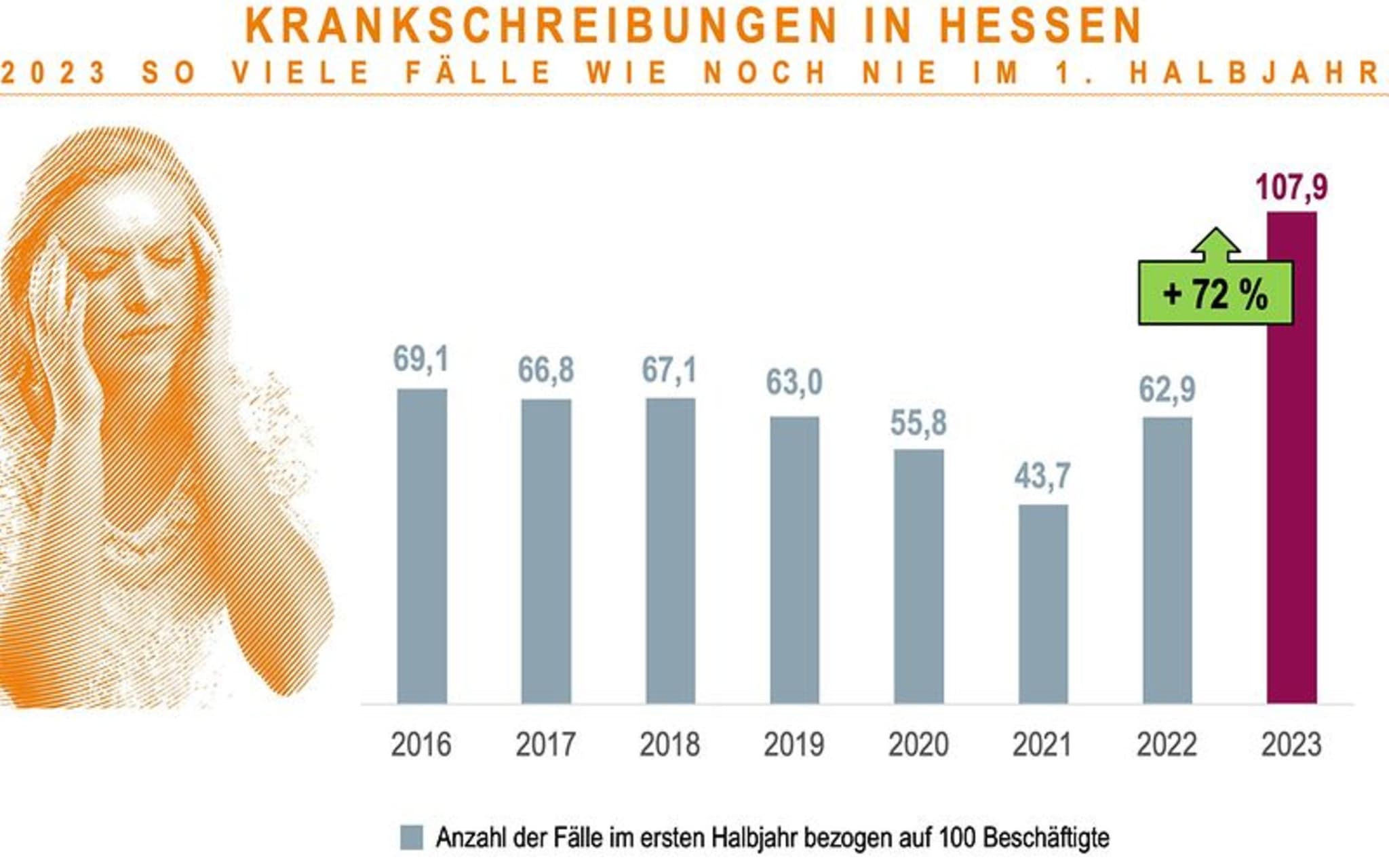 Frankfurt, 14. August 2023. Der Krankenstand der Beschäftigten in Hessen ist in den ersten sechs Monaten des laufenden Jahres auf einen neuen Höchststand geklettert. Es gab 72 Prozent mehr Fälle als im Vorjahreshalbjahr. Über die Hälfte der Arbeitnehmerinnen und Arbeitnehmer hatten bis Ende Juni 2023 bereits mindestens eine Krankschreibung. So eine hohe Quote (53,4 Prozent) wird gewöhnlich erst am Ende eines Jahres erreicht. Nach einer aktuellen Analyse der DAK-Gesundheit stieg der Krankenstand auf 5,6 Prozent. Das ist der höchste Stand in Hessen seit dem Start der Halbjahresstatistik vor sieben Jahren, teilte die Kasse mit.