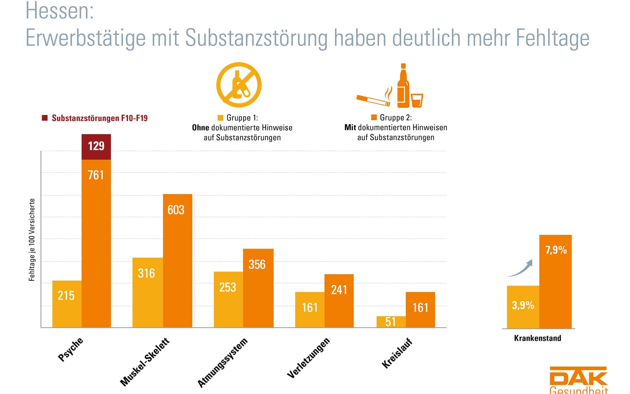 Laut DAK-Gesundheitsreport 2019 haben hessische Arbeitnehmer mit Hinweisen auf eine so genannte Substanzstörung deutlich mehr Fehltage im Job als ihre Kollegen ohne auffällige Probleme. Der Krankenstand der Betroffenen ist mit 7,9 Prozent fast doppelt so hoch. Sie fehlen aber nicht nur im Job, weil sie wegen ihrer Suchtproblematik krankgeschrieben werden. Vielmehr zeigen sich bei ihnen in allen Diagnosegruppen mehr Fehltage. Besonders deutlich ist der Unterschied bei den psychischen Leiden. Hier sind die Fehltage viermal so hoch. Bei Muskel-Skelett-Erkrankungen wie Rückenschmerzen gibt es ein Plus von rund 90 Prozent, bei Atemwegserkrankungen sind es 40 Prozent. Insgesamt gibt es nach der DAK-Studie unter den Erwerbstätigen in Hessen 336.000 abhängige Raucher, 78.000 erfüllen die Kriterien einer Internet Gaming Disorder (Computerspielsucht), rund 9000 Erwerbstätige sind alkoholabhängig.