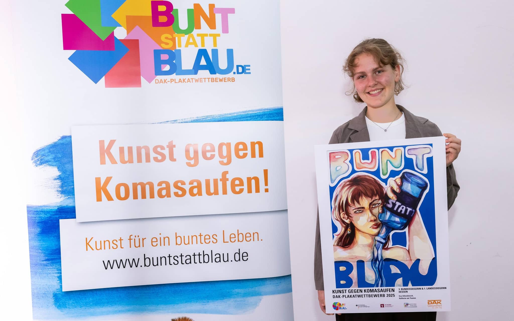 Frankfurt/Berlin, 12. Juni 2025. Erfolg für die hessische Landessiegerin Eva Arkenbosch auch im bundesweiten DAK-Plakatwettbewerb „bunt statt blau – Kunst gegen Komasaufen“: Die 18-jährige Schülerin aus Hofheim am Taunus ist in Berlin mit dem dritten Platz ausgezeichnet worden. Rund 7.000 Schülerinnen und Schüler haben sich in diesem Jahr an der Präventionskampagne der DAK-Gesundheit zum Thema Alkoholmissbrauch beteiligt. Bundesschirmherr ist der Beauftragte der Bundesregierung für Sucht- und Drogenfragen Prof. Dr. Hendrik Streeck. Die Preise wurden am 11. Juli feierlich in Berlin verliehen. Seit dem Start von „bunt statt blau“ 2010 haben insgesamt rund 143.000 Schülerinnen und Schüler zwischen zwölf und 17 Jahren kreative Plakate gegen Alkoholexzesse gestaltet.