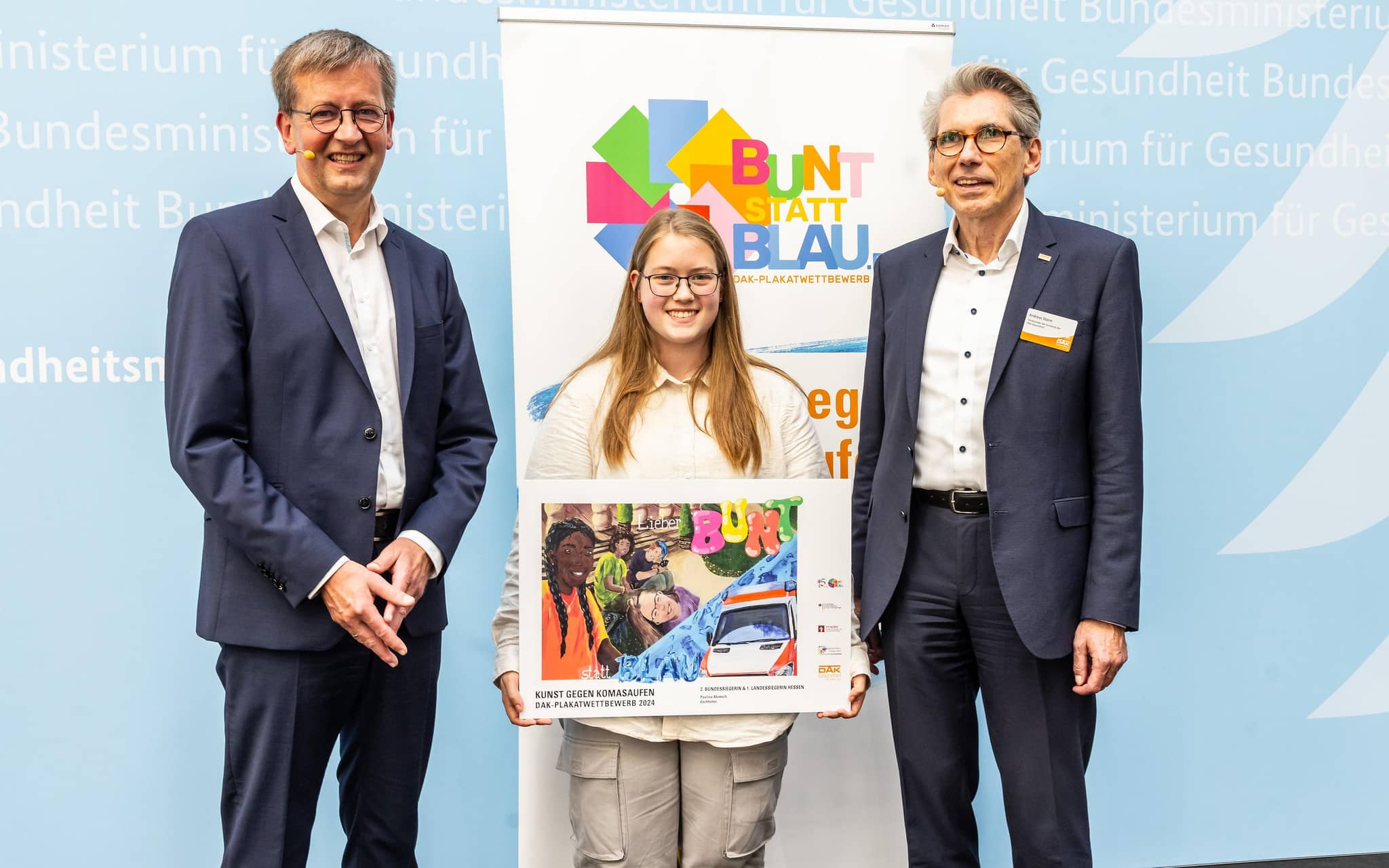 Frankfurt/Berlin, 11. Juli 2024. Erfolg für die hessische Landessiegerin Paulina Abresch auch im bundesweiten DAK-Plakatwettbewerb „bunt statt blau – Kunst gegen Komasaufen“: Die 16-jährige Schülerin aus dem Landkreis Limburg-Weilburg ist in Berlin mit dem zweiten Platz ausgezeichnet worden. Rund 6.000 Schülerinnen und Schüler haben sich in diesem Jahr an der Präventionskampagne der DAK-Gesundheit zum Thema Alkoholmissbrauch beteiligt. Bundesschirmherr ist der Beauftragte der Bundesregierung für Sucht- und Drogenfragen Burkhard Blienert. Die Preise wurden am 11. Juli feierlich im Bundesgesundheitsministerium in Berlin verliehen. Seit dem Start von „bunt statt blau“ 2010 haben insgesamt rund 136.000 Schülerinnen und Schüler zwischen zwölf und 17 Jahren kreative Plakate gegen das exzessive Rauschtrinken gestaltet.