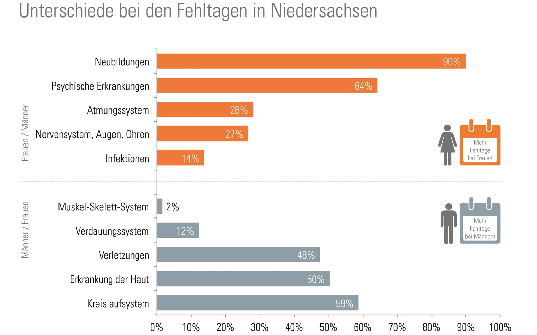 Beim Geschlecht schauen wir dieses Mal ganz genau hin. Und unser Report für Niedersachsen zeigt: Der viel zitierte kleine Unterschied zwischen Frauen und Männern ist viel größer als gedacht. Sowohl die Fehlzeiten im Job als auch das Diagnosespektrum unterscheiden sich deutlich. Diese Differenzen sind kein spezifisches Phänomen der berufstätigen Versicherten der DAK-Gesundheit in Niedersachsen. Auch die Statistik des Bundesministeriums für Gesundheit weist dies aus.