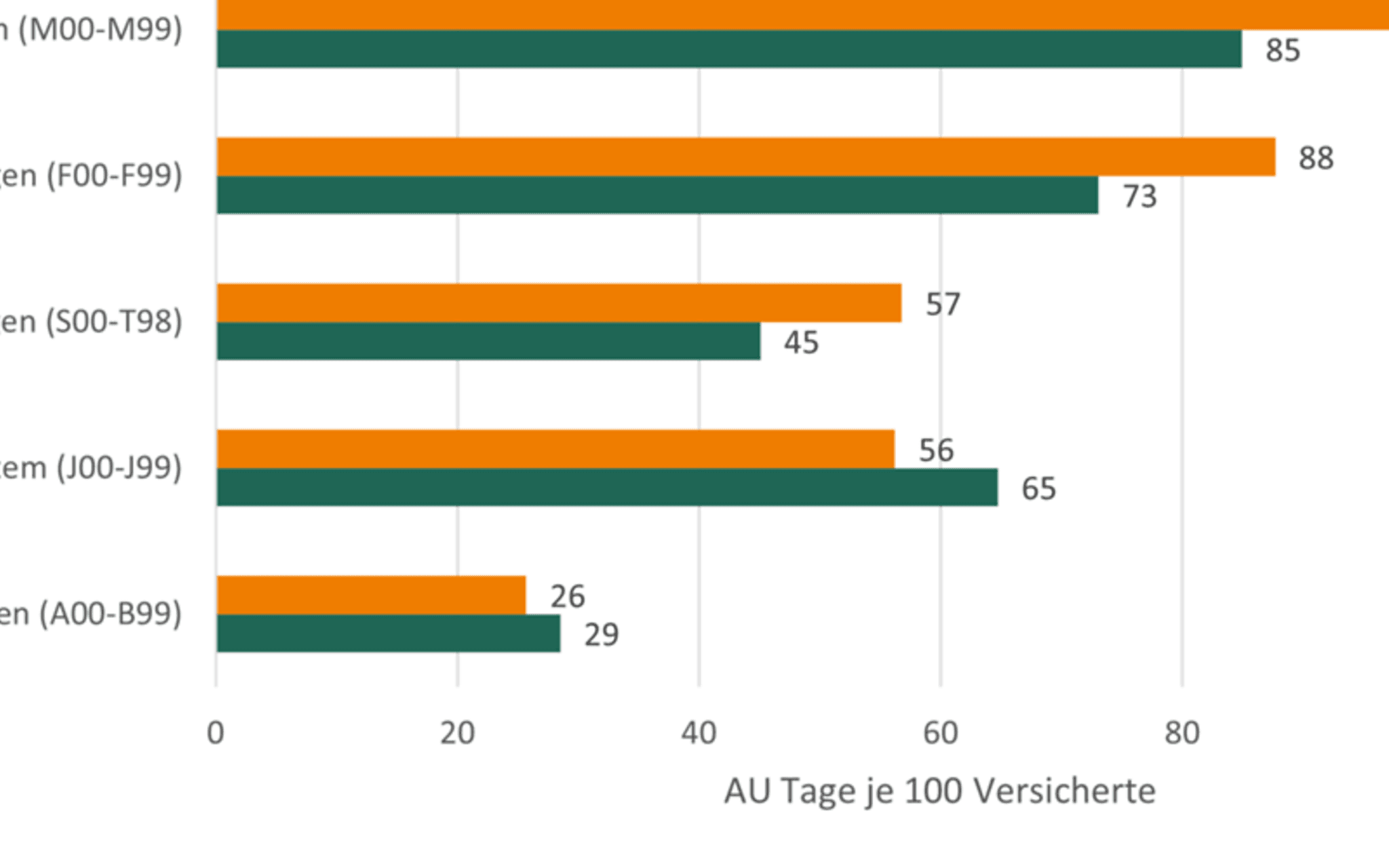 Den stärksten Anstieg verzeichneten Muskel-Skelett-Probleme und psychische Erkrankungen. In der letzteren Gruppe – zu der auch Depressionen und Angststörungen gehören – ging der Arbeitsausfall um 20 Prozent hoch, von 73 auf 88 Fehltage je 100 Beschäftigte.