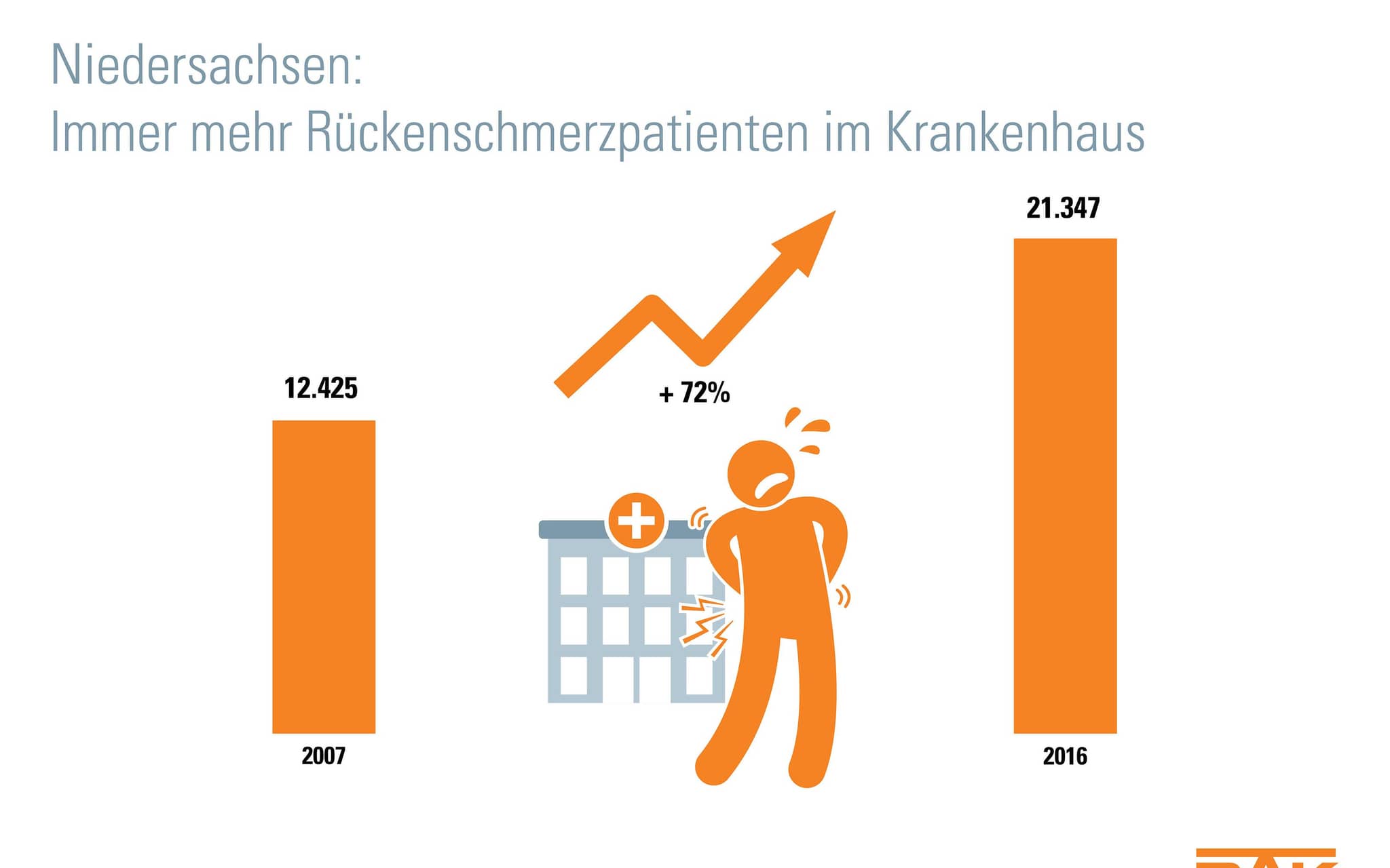 11. April 2018. Rätsel Rücken: Trotz Prävention und zahlreicher Gesundheitskurse ist Rückenschmerz in Niedersachsen die zweitwichtigste Diagnose für den Krankenstand. Hochgerechnet auf alle Erwerbstätigen im Land kamen 2017 mehr als 3,5 Millionen Ausfalltage wegen Rückenschmerzen zusammen. Das zeigt der aktuelle DAK-Gesundheitsreport „Rätsel Rücken – warum leiden so viele Niedersachsen unter Schmerzen?“. Laut Umfrage im Rahmen des Reports leiden mehr als 2,9 Millionen Erwerbstätige unter Rückenschmerzen, rund 507.000 erwerbstätige Patienten in Niedersachsen (13 Prozent) sogar chronisch unter Schmerzen, die drei Monate oder länger andauern. Immer mehr gehen mit ihren Beschwerden direkt ins Krankenhaus. Seit dem Jahr 2007 stieg die Zahl der stationären Behandlungen in Niedersachsen um 72 Prozent an. Knapp die Hälfte der Patienten ließ sich als Notfall aufnehmen.