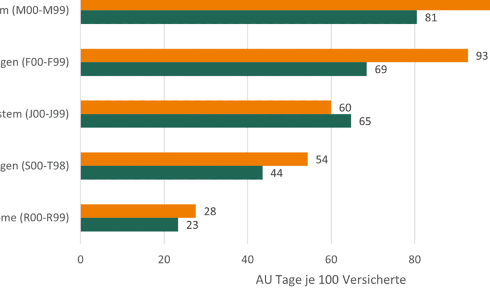 Den stärksten Anstieg verzeichneten Muskel-Skelett-Probleme und psychische Erkrankungen. In der letzteren Gruppe – zu der auch Depressionen und Angststörungen gehören – ging der Arbeitsausfall um 35,4 Prozent hoch, von 69 auf 93 Fehltage je 100 Beschäftigte.