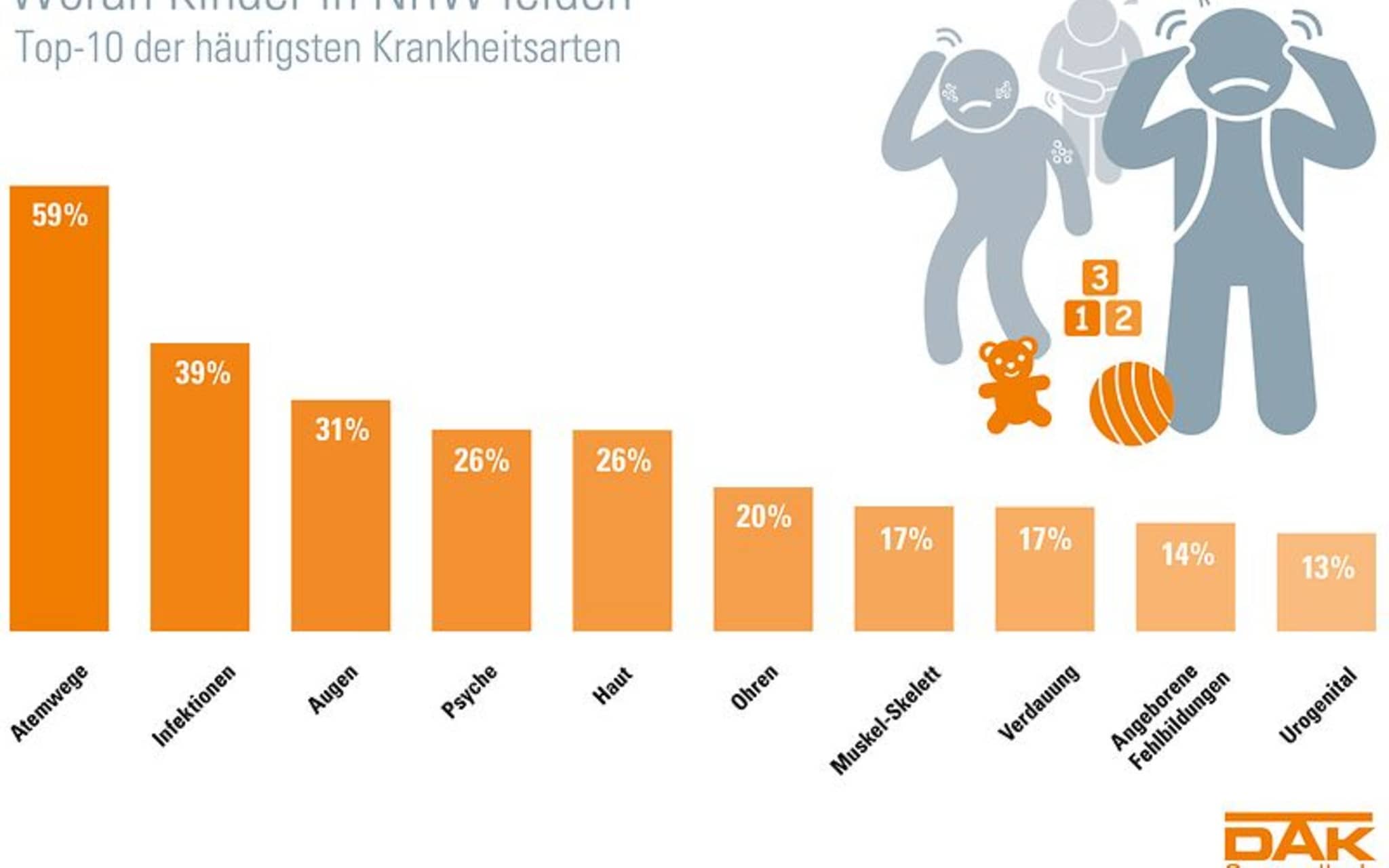 Kinder in Nordrhein-Westfalen sind vergleichsweise kränker als im Bundesdurchschnitt. Zwar dominieren dieselben Erkrankungen wie auf Bundesebene, aber der Anteil der betroffenen Kinder ist vielfach höher. „Mit dem Kinder- und Jugendreport liegen nun belastbare Analysen zur regionalen Häufigkeit bestimmter Erkrankungen im Vergleich zum Bundesdurchschnitt vor“, erklärt Julian Witte, Autor der Studie bei der Universität Bielefeld. „Die Untersuchung im Auftrag der DAK-Gesundheit ist die erste kontinuierliche und erkrankungsartenübergreifende Analyse von solchen regionalen Abrechnungsdaten einer gesetzlichen Krankenkasse.“