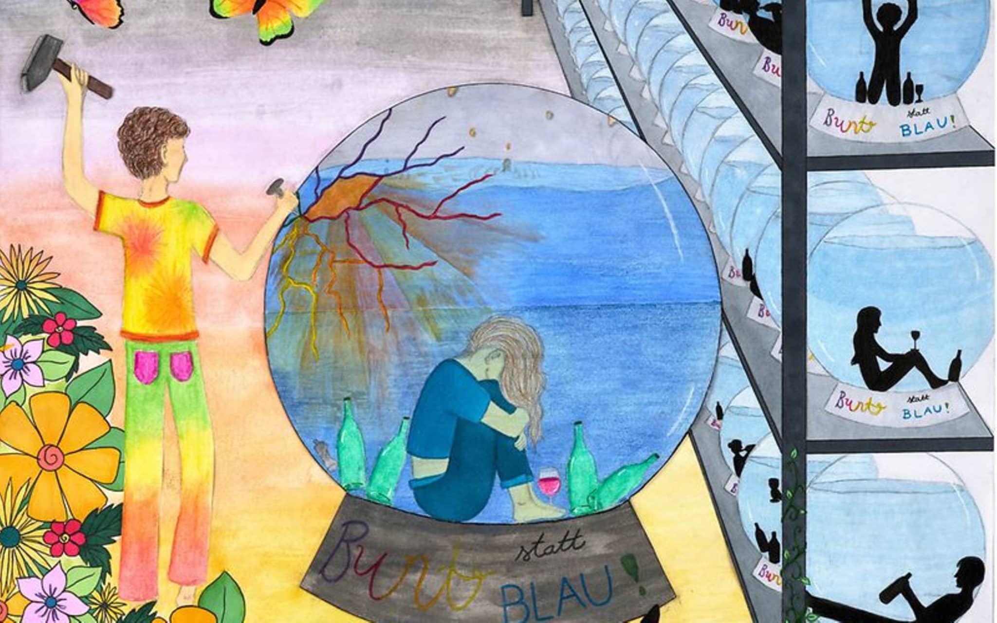 „Mein Bild soll aussagen, dass es sehr schwer sein kann, aus einer Alkoholsucht zu entkommen und dass man Hilfe von außen annehmen darf und soll! Ich habe mir vorgestellt, dass es sich vielleicht so anfühlen könnte, als wäre man in einer Blase oder Kugel gefangen, in einem Teufelskreis, aus dem es ohne Hilfe kein Entkommen gibt, aber dass diese Kugel auch zerplatzen kann, wenn man es zulässt“, so beschreibt Antonia Ziegler ihre Motivation, an dem Wettbewerb teilzunehmen. Mit ihrer beeindruckenden Arbeit gewann die siebzehnjährige Schülerin des Engelbert-von-Berg-Gymnasiums in Wipperfürth den Hauptpreis von 300 Euro. Der zweite Platz ging an die Einzelteilnehmerin Sophie Zeidler (16) aus Köln. Den dritten Rang belegte Melissa aus Ochtrup. Sie besucht die Klasse 10 des Städtischen Gymnasiums. Den Sonderpreis „Junge Talente“ erhielt Ida Löhr (12) aus Wipperfürth, sie besucht die Klasse 7c des Engelbert-von-Berg-Gymnasium.