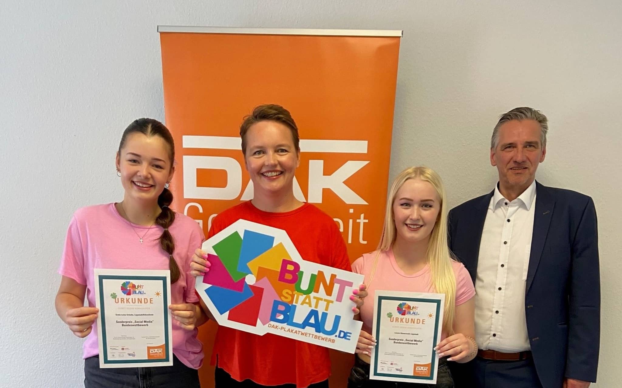 Düsseldorf/Berlin, 12. Juni 2025. Der „Sonderpreis Social Media“ beim Bundeswettbewerb „bunt statt blau 2025“ geht nach Nordrhein-Westfalen: Die Schülerinnen Greta Schulte und ihre Freundinnen Leonie Steuerwald und Neele Radin aus Lippstadt gewinnen mit ihrem Videobeitrag auf YouTube. Rund 7.000 Schülerinnen und Schüler beteiligten sich in diesem Jahr an der Präventionskampagne der DAK-Gesundheit zum Thema Alkoholmissbrauch. Bereits zum 16. Mal suchte die Kasse die besten Plakate und Social Media-Beiträge gegen das Rauschtrinken. Bundesschirmherr ist der neue Beauftragte der Bundesregierung für Sucht- und Drogenfragen Prof. Dr. Hendrik Streeck. Seit dem Start von „bunt statt blau“ 2010 haben insgesamt rund 143.000 Schülerinnen und Schüler zwischen zwölf und 17 Jahren kreative Plakate gegen Alkoholexzesse gestaltet.