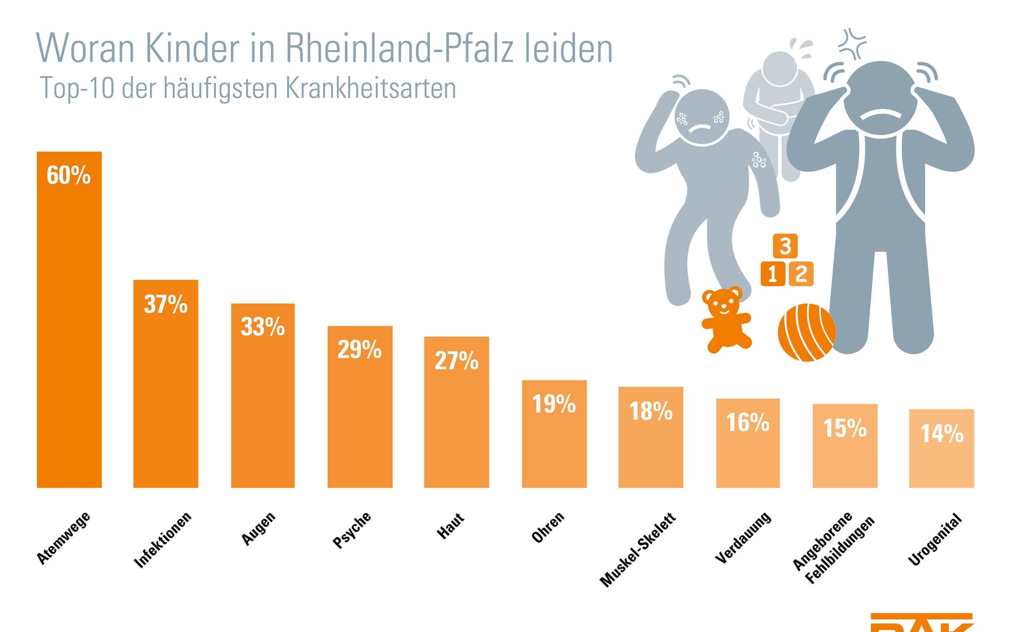14. Februar 2019. Neurodermitis, Asthma, Heuschnupfen – in Rheinland-Pfalz ist mehr als jedes vierte Kind körperlich chronisch krank. Fast jedes Zehnte leidet an einer psychischen Erkrankung mit potentiell chronischem Verlauf. Das zeigt der neue Kinder- und Jugendreport der DAK-Gesundheit. Für die Studie hat die Krankenkasse Versichertendaten von rund 37.000 Kindern in Rheinland-Pfalz ausgewertet. Demnach sind 90 Prozent aller Jungen und Mädchen wenigstens einmal im Jahr beim Arzt oder im Krankenhaus. Dabei zeigt sich auch: Bereits Schulkinder leiden vermehrt unter krankhaftem Übergewicht und Rückenschmerzen. Für die Versorgung aller Minderjährigen in Rheinland-Pfalz gibt die DAK-Gesundheit im Jahr 35,7 Millionen Euro aus.