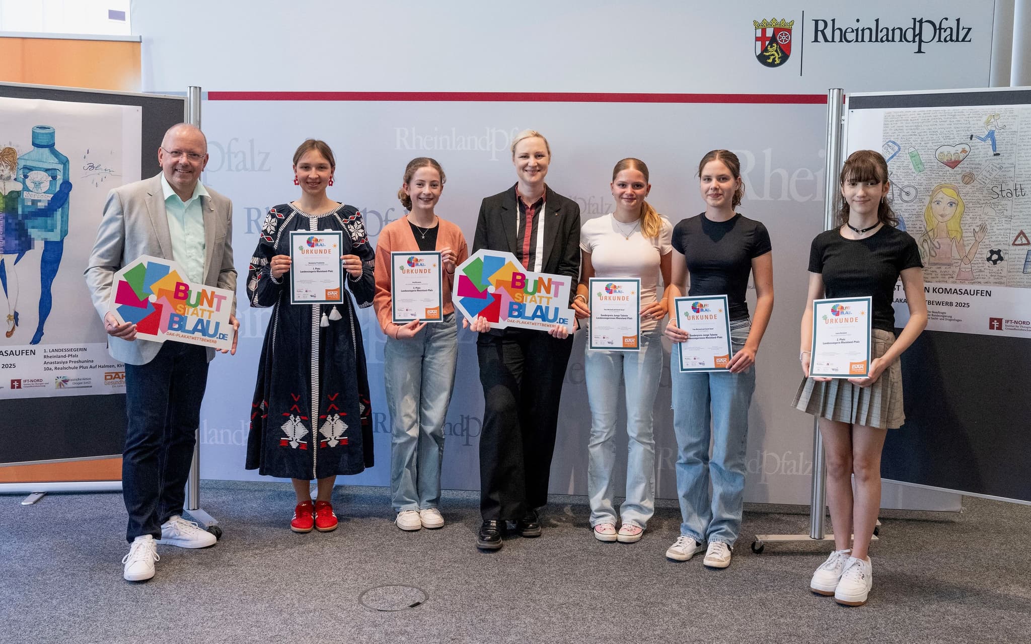 Mainz, 19. Mai 2025. „bunt statt blau“: Unter diesem Motto haben sich im Frühjahr bundesweit mehr als 7.000 Schülerinnen und Schüler am Plakatwettbewerb der DAK-Gesundheit gegen das sogenannte Komatrinken bei Jugendlichen beteiligt. In Rheinland-Pfalz kommt das beste Plakat für die Präventionskampagne der Krankenkasse von der 16-jährigen Anastasiya Proshunina von der Realschule Plus Auf Halmen in Kirn. Sie setzte sich gegen rund 400 Teilnehmerinnen und Teilnehmer im Land durch und wurde zusammen mit den weiteren Landessiegerinnen in Mainz geehrt. Sozialministerin Dörte Schall übergab als Schirmherrin der Aktion in Rheinland-Pfalz die Preise und Urkunden.