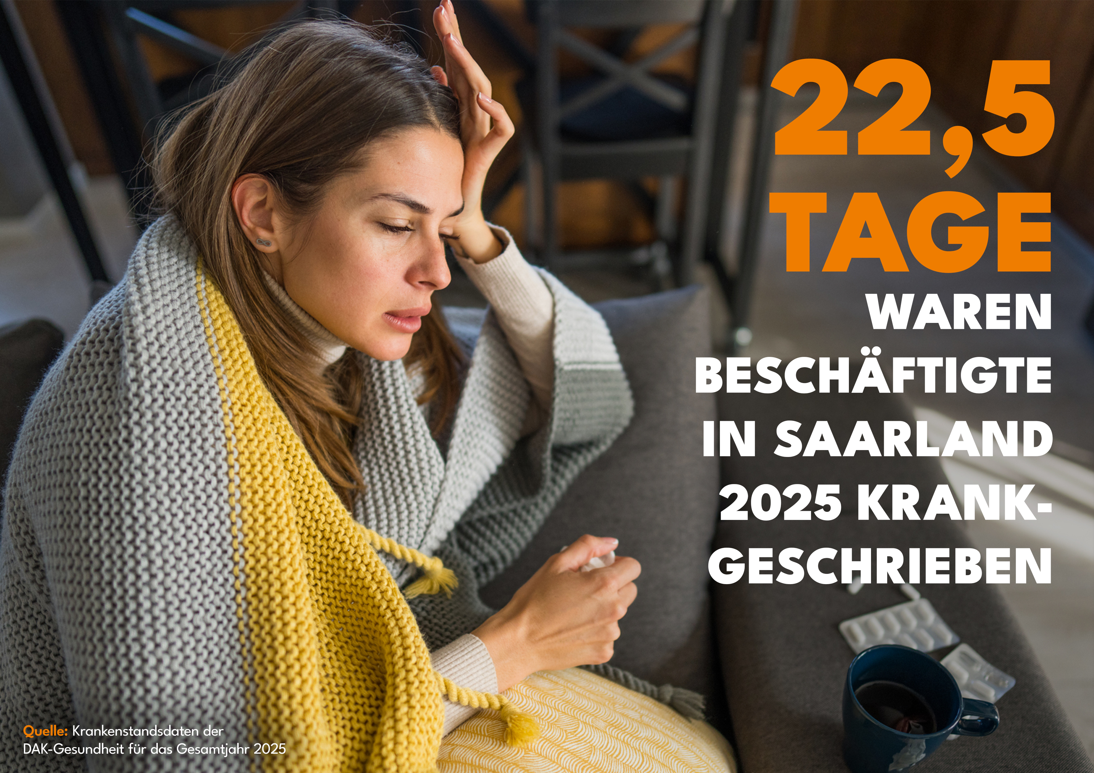 Saarbrücken, 23. Januar 2026. Der Krankenstand im Saarland ist 2025 im Vergleich zum Vorjahr leicht zurückgegangen. DAK-versicherte Beschäftigte waren durchschnittlich an 22,5 Kalendertagen krankgeschrieben und hatten demnach etwas weniger Arbeitsausfall als im Vorjahr. Die meisten Fehltage gingen auf das Konto von psychischen Erkrankungen. Sie verursachen 3,4 Prozent weniger Fehltage als 2024. Weitere wichtige Ursachen waren Atemwegsinfekte auf Rang zwei und Muskel-Skelett-Erkrankungen auf Rang drei. Insgesamt bleibt der Krankenstand im Saarland auf einem hohen Niveau ein. Deshalb fordert die DAK-Gesundheit eine fundierte Ursachenforschung. Arbeitgeber, Gewerkschaften, Ärzteschaft und Krankenkassen sollten gemeinsam an einen Tisch kommen, um neue Lösungswege zu entwickeln und auch ein gesundes Arbeitsumfeld in den Fokus zu rücken.