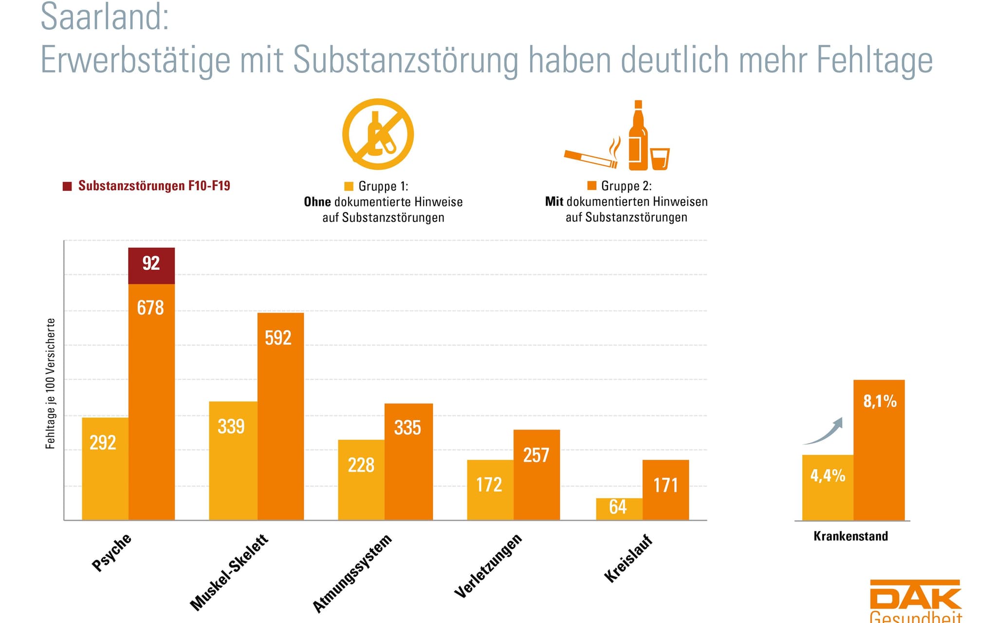 Laut DAK-Gesundheitsreport 2019 haben saarländische Arbeitnehmer mit Hinweisen auf eine so genannte Substanzstörung deutlich mehr Fehltage im Job als ihre Kollegen ohne auffällige Probleme. Der Krankenstand der Betroffenen ist mit 8,1 Prozent fast doppelt so hoch. Sie fehlen aber nicht nur im Job, weil sie wegen ihrer Suchtproblematik krankgeschrieben werden. Vielmehr zeigen sich bei ihnen in allen Diagnosegruppen mehr Fehltage. Besonders deutlich ist der Unterschied bei den psychischen Leiden. Hier sind die Fehltage mehr als doppelt so hoch. Bei Muskel-Skelett-Erkrankungen wie Rückenschmerzen gibt es ein Plus von rund 75 Prozent, bei Atemwegserkrankungen sind es 46 Prozent. Insgesamt gibt es nach der DAK-Studie unter den Erwerbstätigen im Saarland 69.000 abhängige Raucher, knapp 5.000 erfüllen die Kriterien einer Internet Gaming Disorder (Computerspielsucht), rund 2.000 Erwerbstätige sind alkoholabhängig.