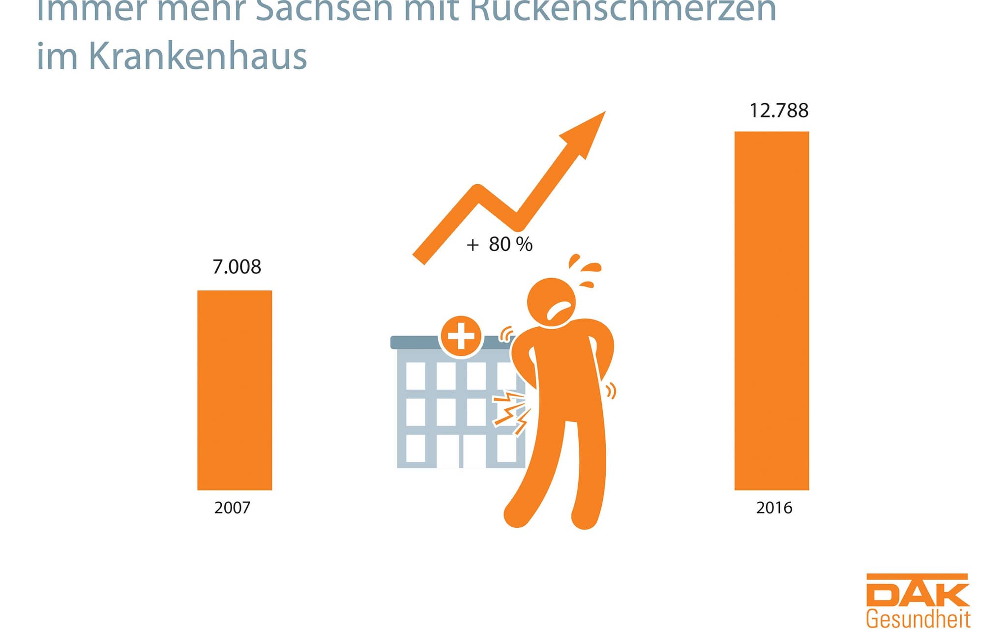Dresden, 3. Mai 2018. Rätsel Rücken: Trotz Prävention und zahlreicher Gesundheitskurse leiden in Sachsen mehr als 1,4 Millionen Erwerbstätige unter Rückenschmerzen, rund 60.000 von ihnen sogar chronisch. Immer mehr gehen mit ihren Beschwerden direkt ins Krankenhaus. Seit dem Jahr 2007 stieg die Zahl der stationären Behandlungen in Sachsen um mehr als 80 Prozent an. Hochgerechnet auf alle Erwerbstätigen im Land kamen 2017 rund 2,1 Millionen Ausfalltage wegen Rückenschmerzen zusammen. Das zeigt der aktuelle DAK-Gesundheitsreport „Rätsel Rücken – warum leiden so viele Sachsen unter Schmerzen?“. Nach der Umfrage hatten 73 Prozent aller Beschäftigten im vergangenen Jahr Rückenschmerzen. Jeder Vierte hat aktuell Beschwerden.
