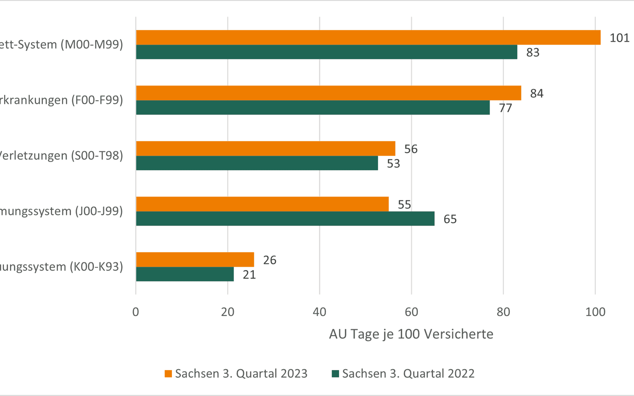 Den stärksten Anstieg in Sachsen gab es mit gut einem Fünftel (22 Prozent) bei den Muskel-Skelett-Beschwerden wie Rückenschmerzen. Sie waren gleichzeitig mit 101 Fehltagen je 100 Beschäftigte Haupt-Ausfallgrund im Freistaat. Bei den psychischen Leiden – zu denen unter anderem Depressionen und Angststörungen gehören – stieg der Arbeitsausfall um neun Prozent auf 84 Fehltage je 100 Beschäftigte. Atemwegserkrankungen wie Erkältungen oder Bronchitis gingen dagegen um 15 Prozent zurück und verursachten 55 Fehltage je 100 Beschäftigte.