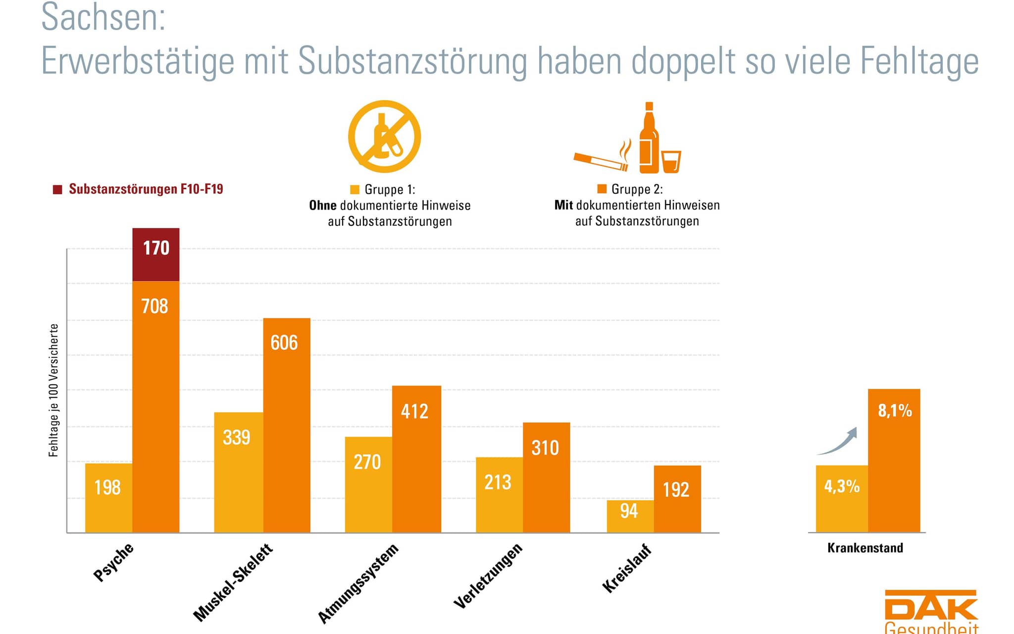 Laut DAK-Gesundheitsreport 2019 haben Arbeitnehmer in Sachsen mit Hinweisen auf eine so genannte Substanzstörung deutlich mehr Fehltage im Job als ihre Kollegen ohne auffällige Probleme. Der Krankenstand der Betroffenen ist mit 8,1 Prozent fast doppelt so hoch. Sie fehlen aber nicht nur im Job, weil sie wegen ihrer Suchtproblematik krankgeschrieben werden. Vielmehr zeigen sich bei ihnen in allen Diagnosegruppen mehr Fehltage. Besonders deutlich ist der Unterschied bei den psychischen Leiden. Hier sind es viermal so viele Fehltage. Bei Muskel-Skelett-Erkrankungen wie Rückenschmerzen gibt es ein Plus von 79 Prozent, bei Atemwegserkrankungen sind es 53 Prozent. Insgesamt gibt es nach der DAK-Studie unter den Erwerbstätigen in Sachsen 291.000 abhängige Raucher, 20.000 erfüllen die Kriterien einer Internet Gaming Disorder (Computerspielsucht), 7.000 Erwerbstätige sind alkoholabhängig. „Sucht ist eine Krankheit, die jeden treffen kann“, sagt Christine Enenkel, Leiterin der DAK-Landesvertretung in Sachsen. „Wir wollen eine breite und offene Debatte anstoßen. Wir müssen hinsehen und handeln, um Betroffene nicht allein zu lassen. Ist es Genuss, Gewohnheit oder bereits Sucht?“