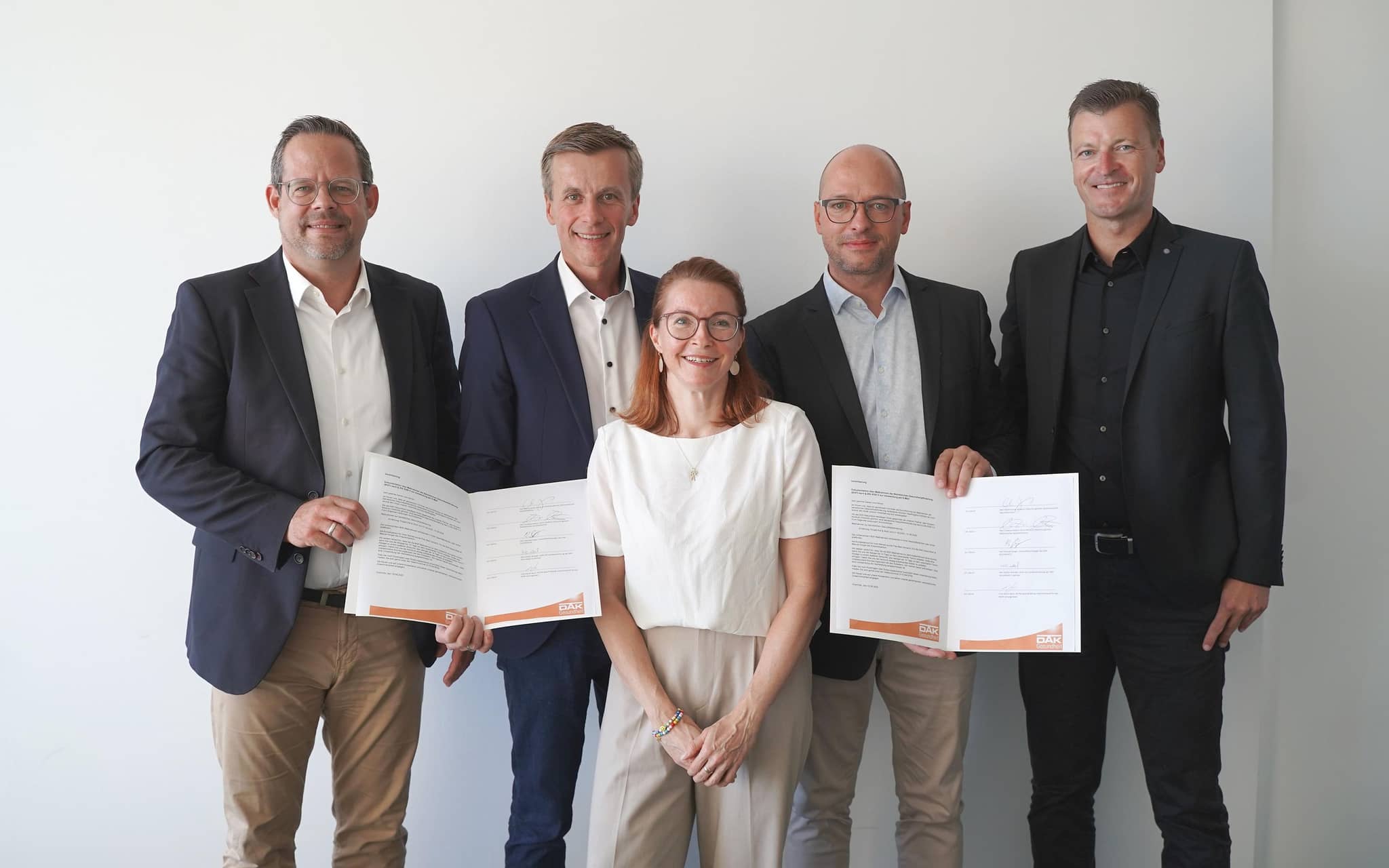 (Copyright: Klinikum Chemnitz /DAK-Gesundheit, v.l.nr.: Martin Jonas, kaufmännischer Geschäftsführer Klinikum Chemnitz; Prof. Dr. med. Martin Wolz, medizinischer Geschäftsführer Klinikum Chemnitz; Katrin Bach, Bereichsleiterin Therapie Tochterunternehmen Poliklinik gGmbH Chemnitz; Stefan Wandel, Leiter der DAK-Landesvertretung Sachsen; Manuel Sorger, Betrieblicher Gesundheitsmanager DAK-Gesundheit)