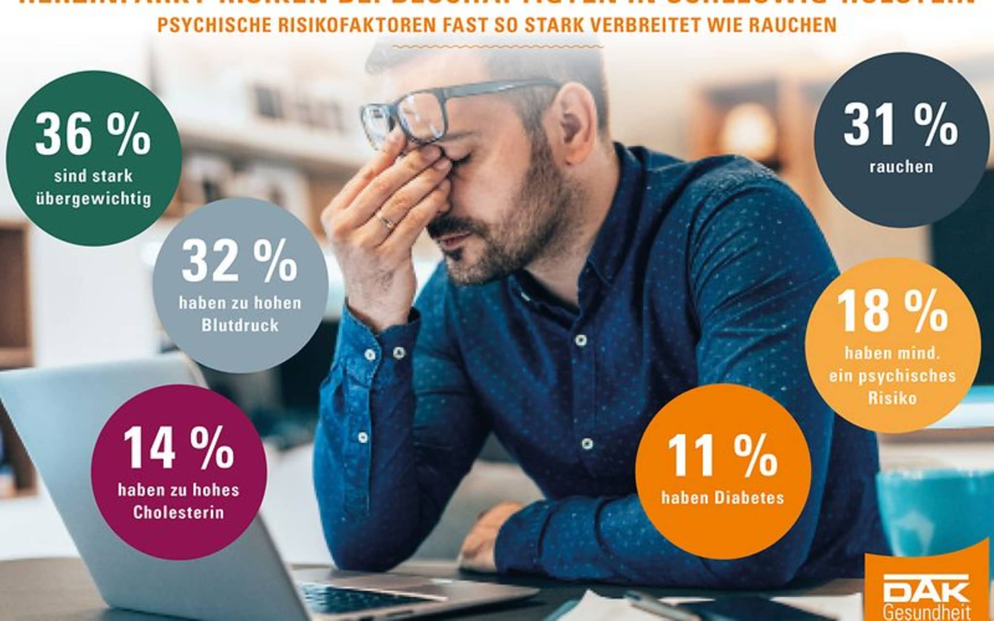 Jedes Jahr sterben mehr als 12.400 Menschen in Schleswig-Holstein an einer Herz-Kreislauf-Erkrankung. „Unser aktueller Gesundheitsreport zeigt, dass die Rolle von Stress und psychischen Erkrankungen als Risiko für Herzinfarkte oft unterschätzt wird“, sagt Cord-Eric Lubinski, Landeschef der DAK-Gesundheit. „Die Fehlzeiten wegen psychischer Erkrankungen steigen seit Jahren. Depressionen und negativer Stress sind bereits für sich genommen eine große Belastung. Sie gehen aber auch buchstäblich ans Herz“. Expertenstimmen zufolge ist das Risiko für einen Herzinfarkt bei Depressionen ähnlich hoch wie bei starkem Übergewicht.