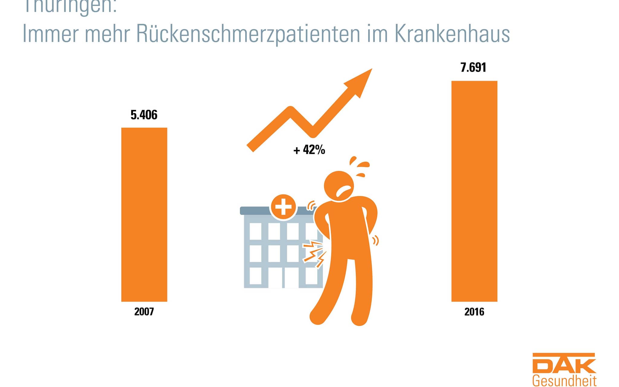 Die Problematik spiegelt sich auch in der stationären Behandlung wider: Thüringen hatte 2016 mehr als 7.600 Krankenhausfällen wegen Rückenschmerzen, ein Anstieg um 42 Prozent in den vergangenen neun Jahren. Der DAK-Report untersucht erstmals detailliert, wie Rückenschmerzpatienten in die Klinik kommen. Fazit: Die Hälfte der Betroffenen wird als Notfall aufgenommen. Im bundesweiten Vergleich liegt die Krankenhausinanspruchnahme der Thüringer bei Rückenschmerzen mit 369 je 100.000 Einwohnern und Jahr deutlich über dem Durchschnitt (306). In den neuen Bundesländern ist nur in Sachsen-Anhalt die Inanspruchnahme mit 425 noch höher. Um den Erwartungen der Betroffenen an die Versorgung in Thüringen möglichst gerecht zu werden und gleichzeitig die Notfallambulanzen der Kliniken zu entlasten, sieht der Leiter der DAK-Landesvertretung Marcus Kaiser Portalpraxen wie in Schleswig-Holstein, medizinische Versorgungszentren, teilstationäre Versorgungsangebote und einen verbesserten Terminservice bei den niedergelassenen Ärzten als wichtige Lösungsansätze.